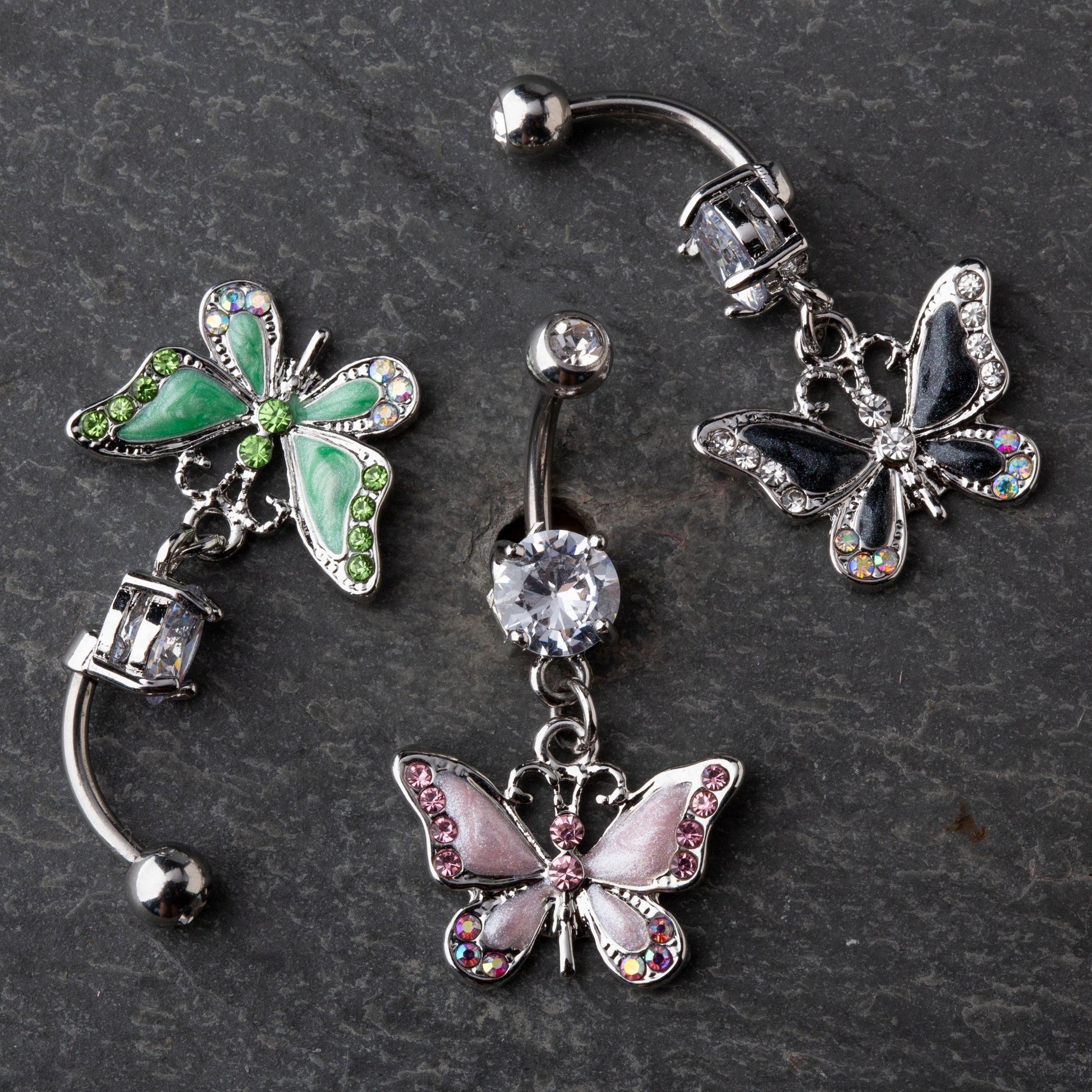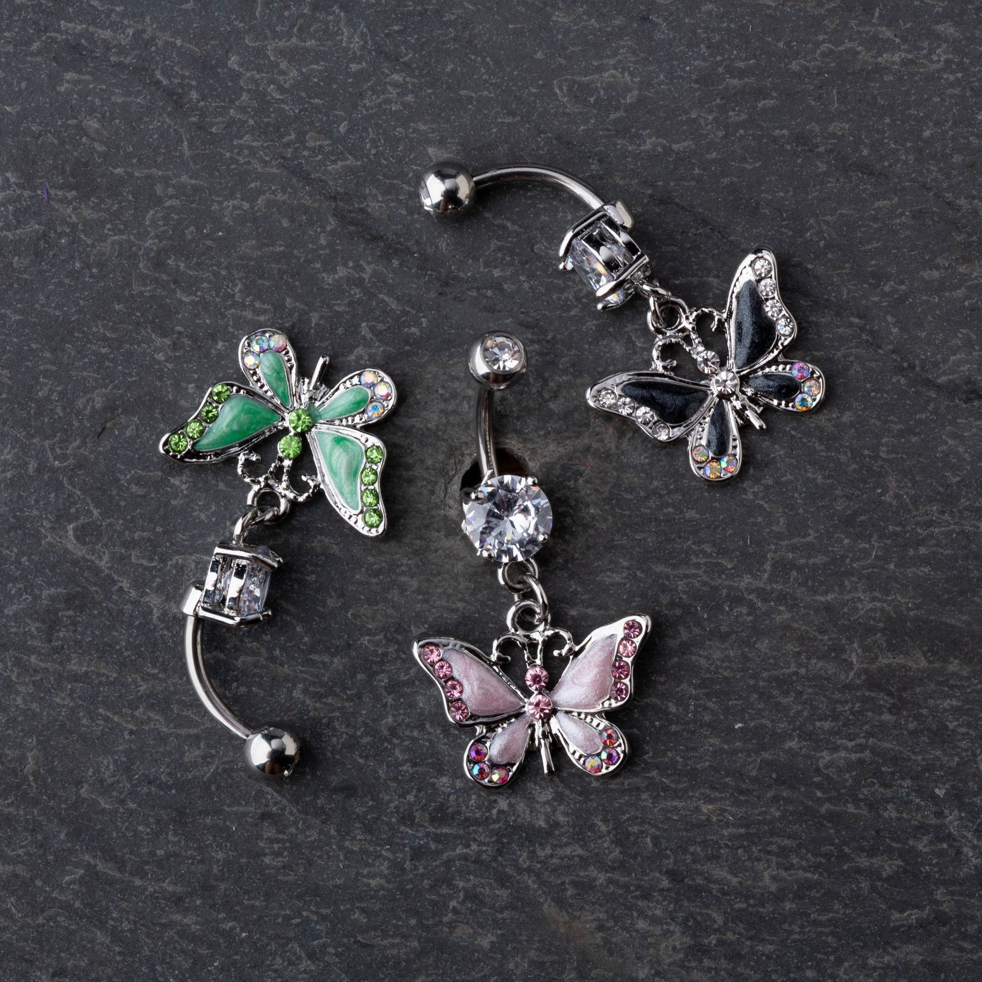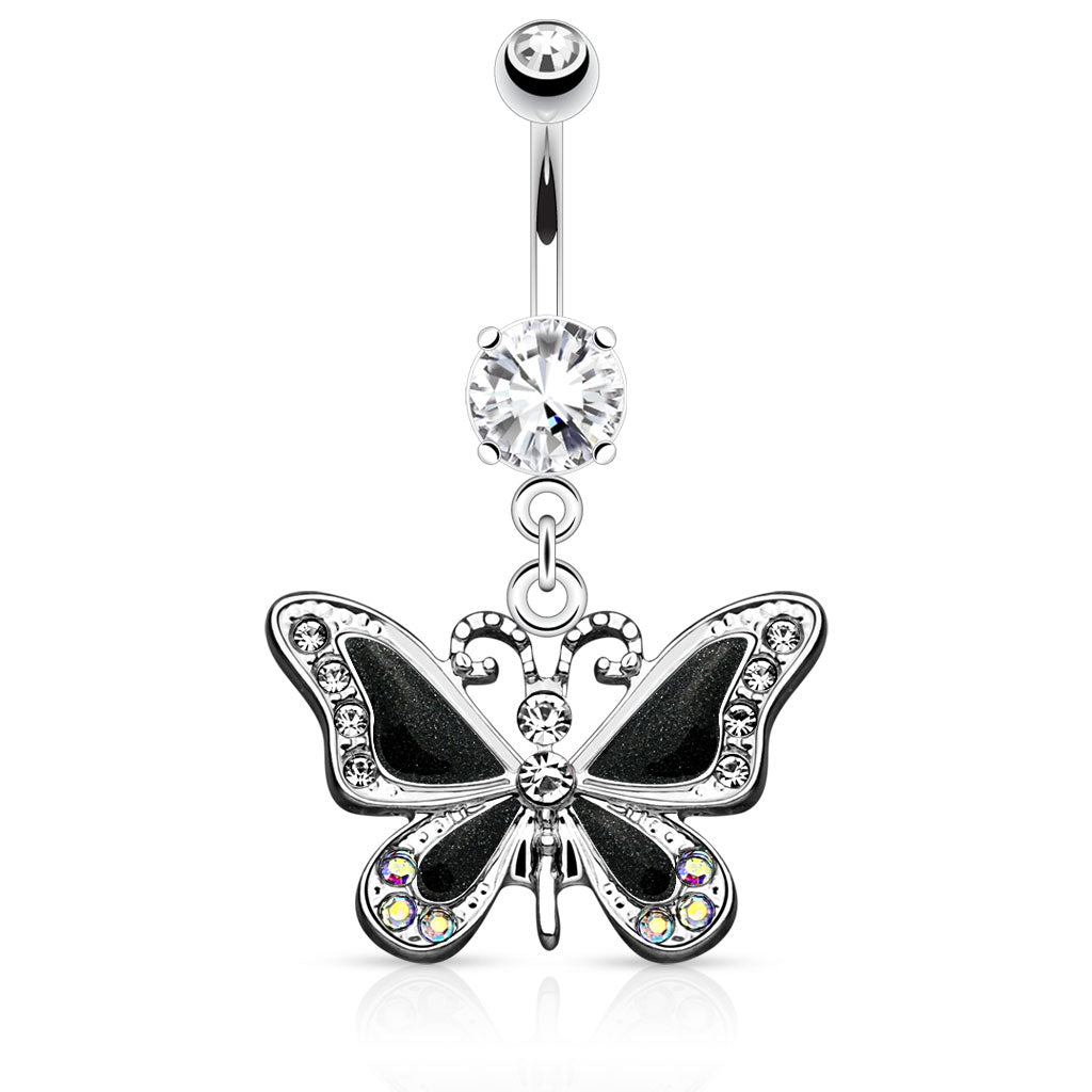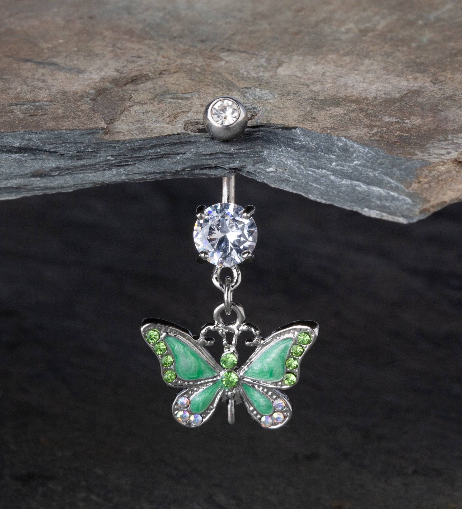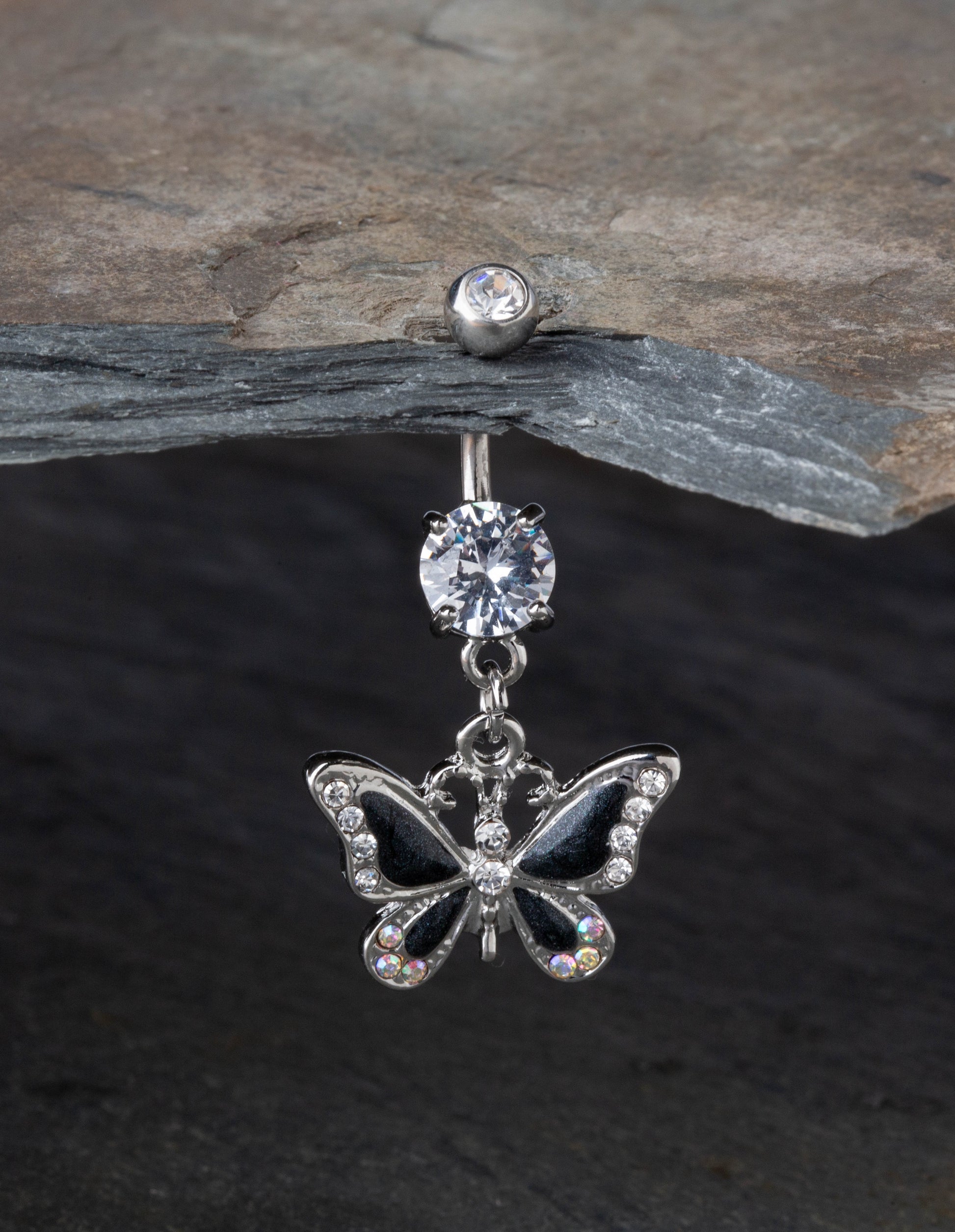 CZ Crystal Butterfly Dangling Belly Button Ring - Stainless Steel