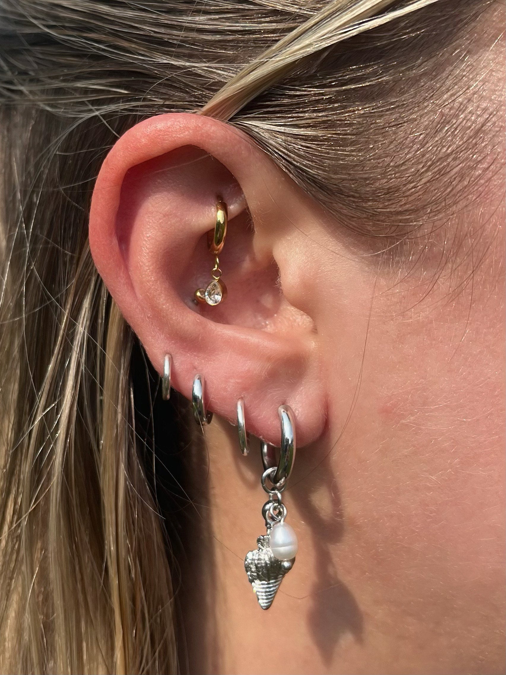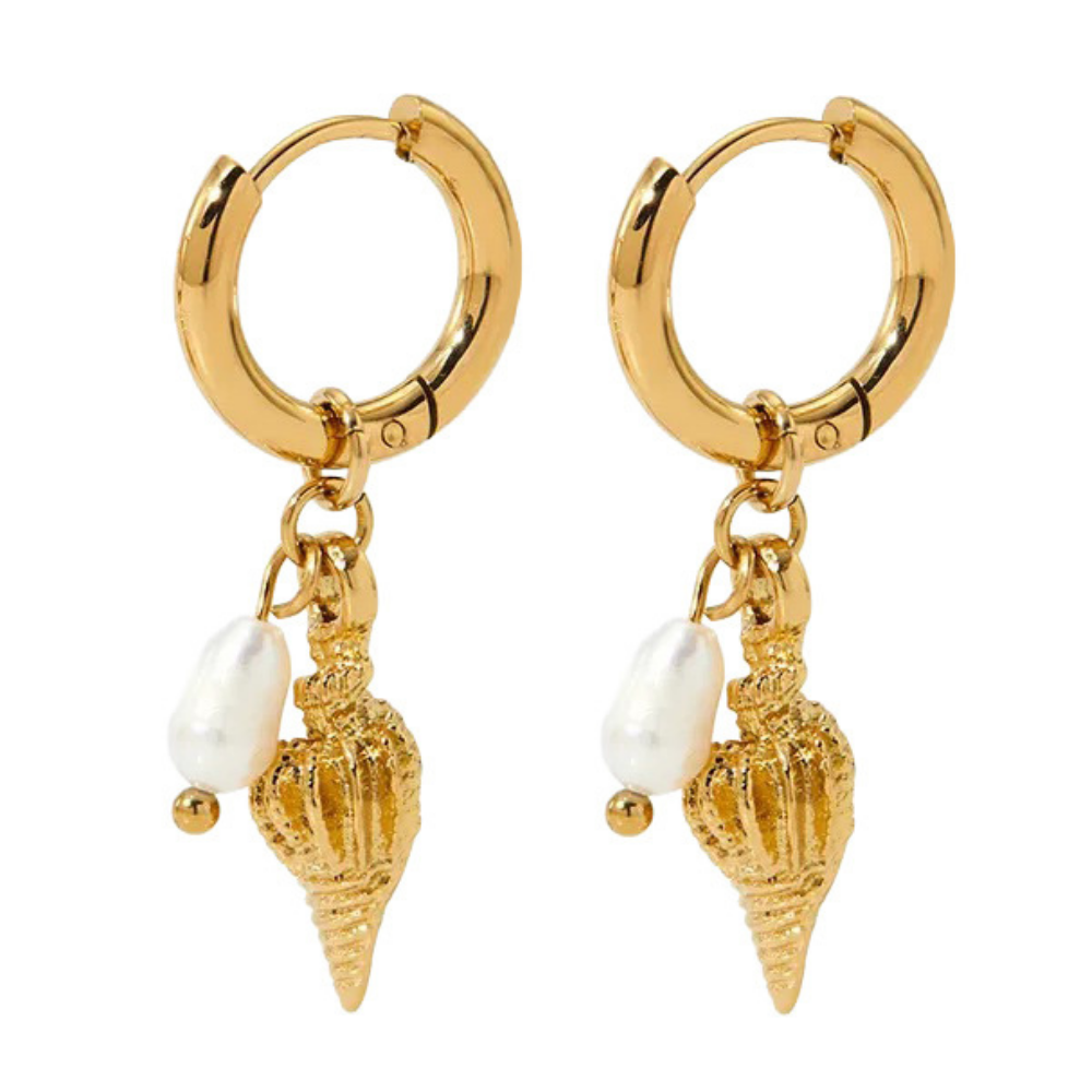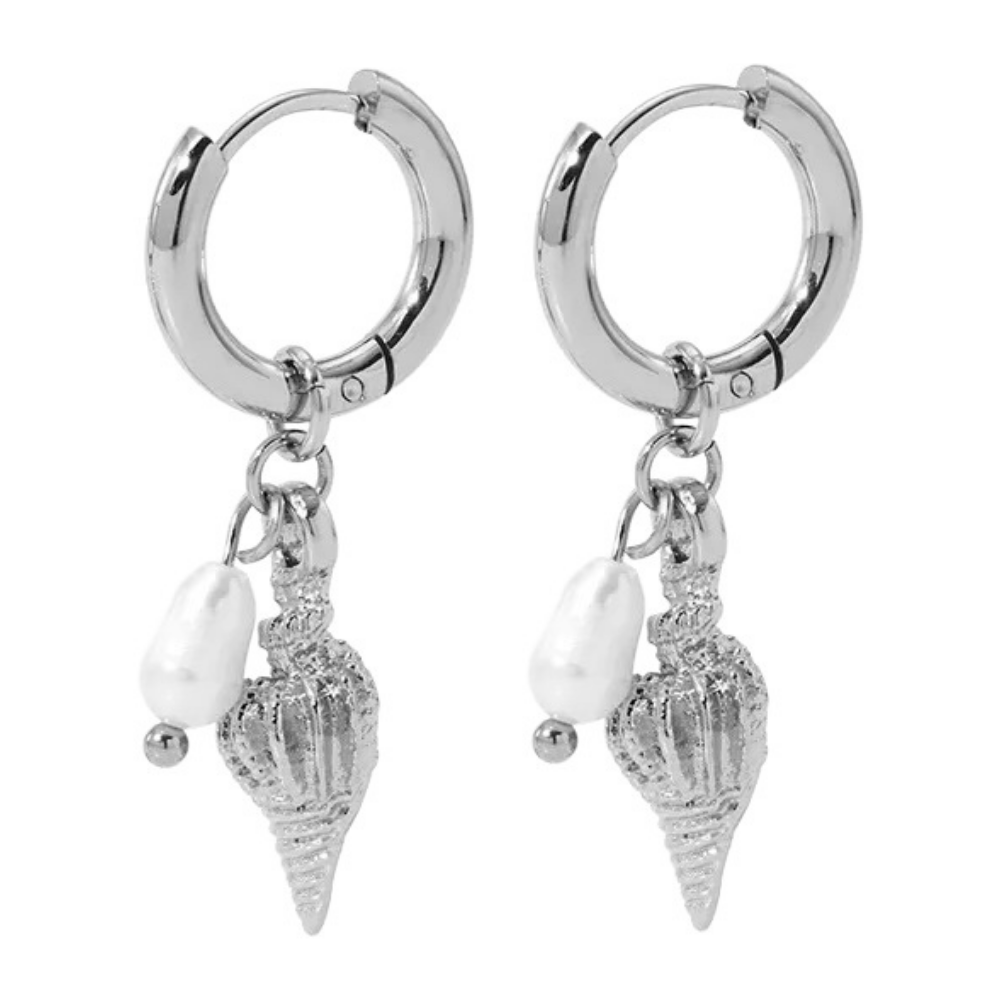 Conch Shell with Faux Pearl Dangling Huggie Hoop Earrings - Pair - Stainless Steel