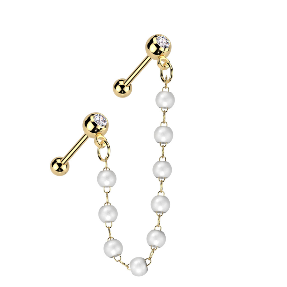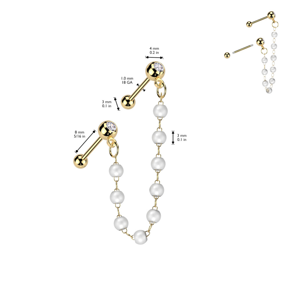 CZ Crystal Barbells with Connecting Faux Pearl Chain - 316L Stainless Steel