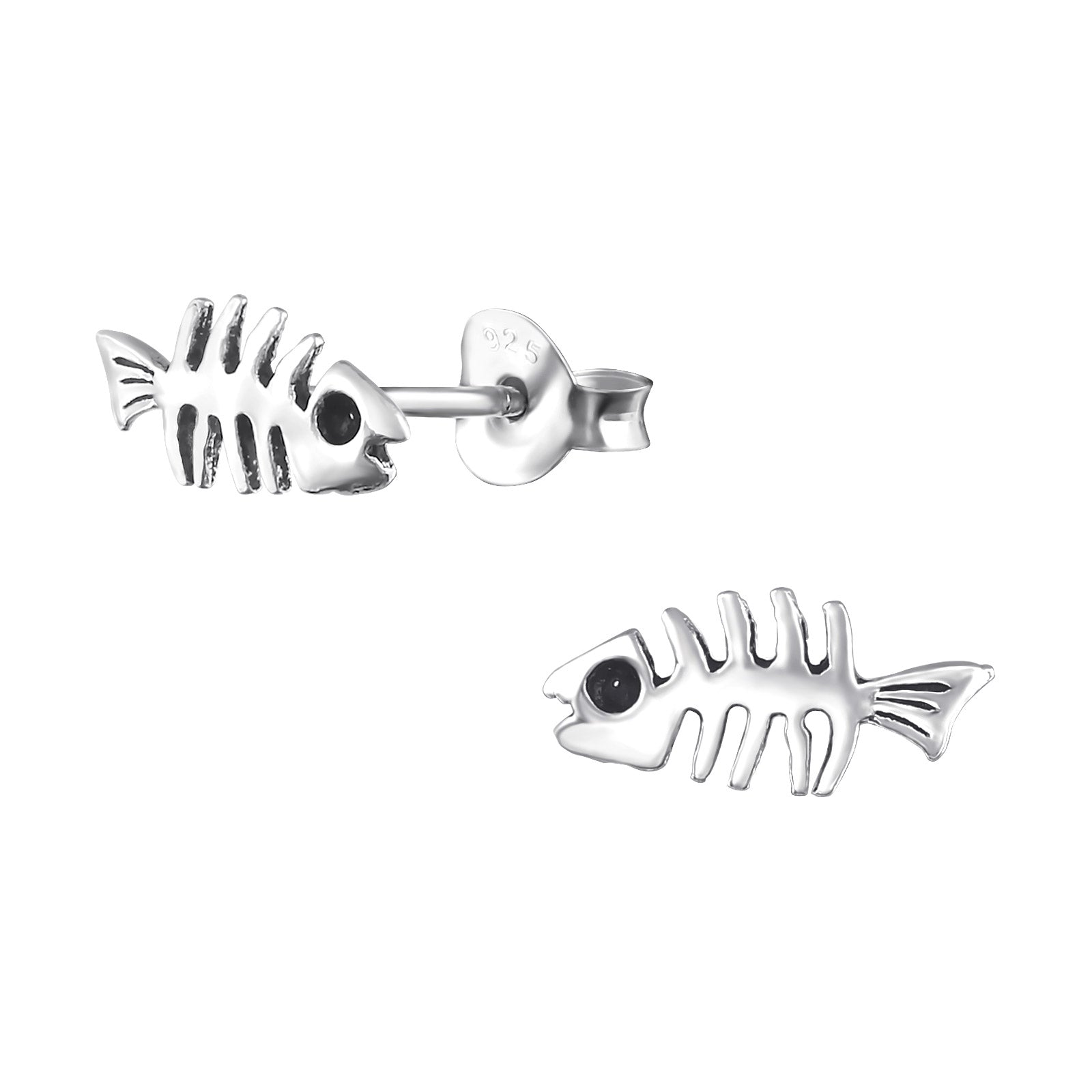 Fishbone Stud Earrings - Pair - Oxidized 925 Sterling Silver