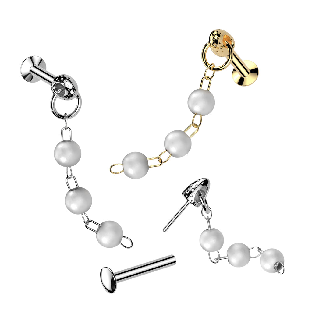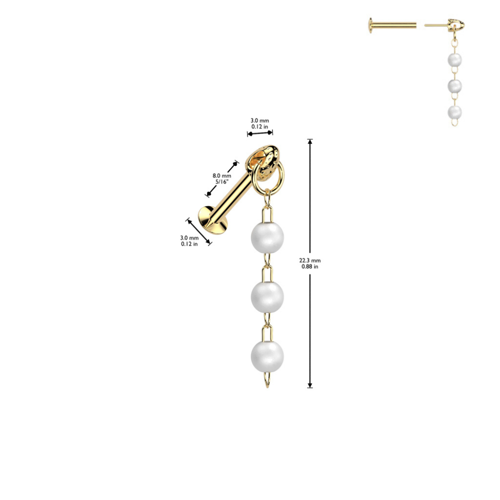 Threadless Push In Triple Dangling Faux Pearl Flat Back Stud - 316L Stainless Steel