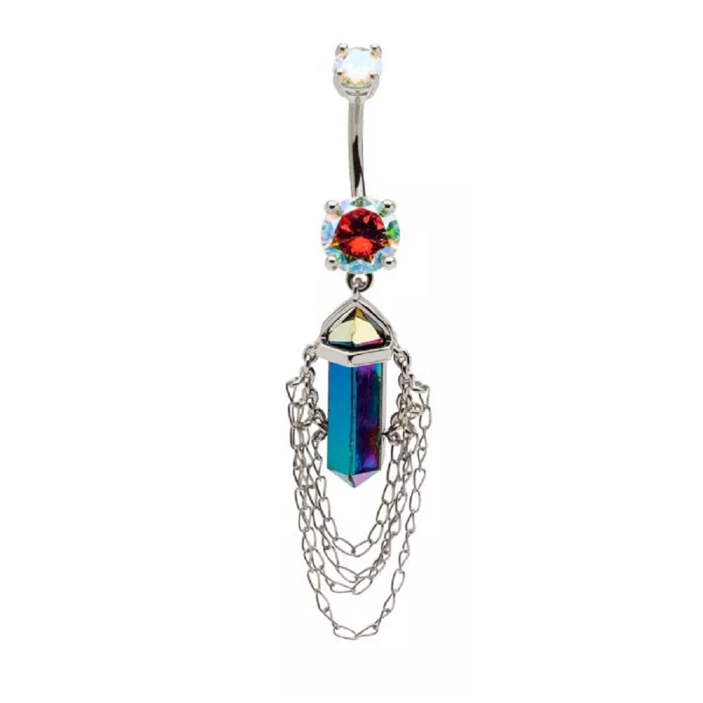 Aurora Borealis Crystal with 4 Tiered Dangling Chains Belly Button Ring - 316L Stainless Steel