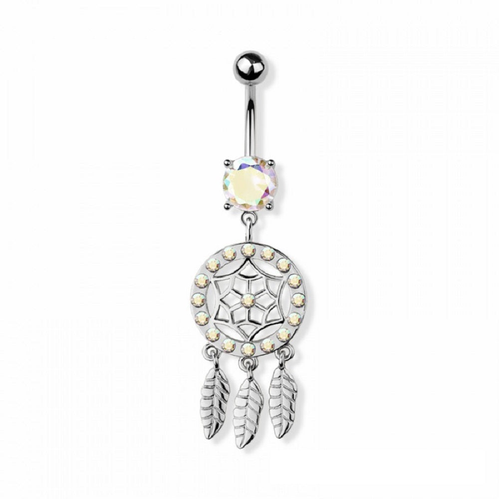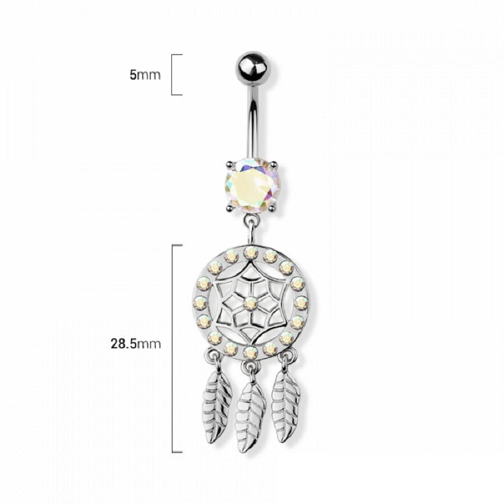 Aurora Borealis CZ Crystal Dreamcatcher Dangling Belly Button Ring - 316L Stainless Steel