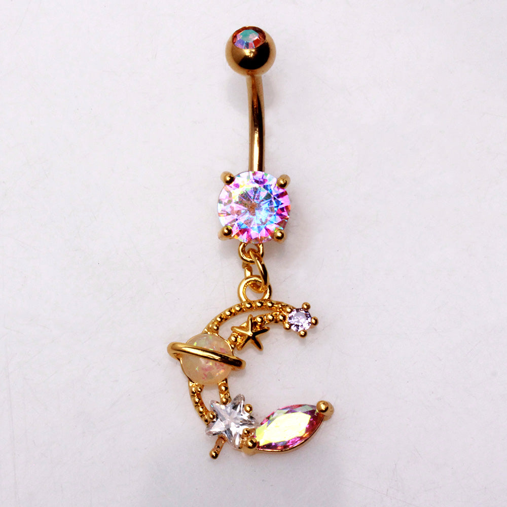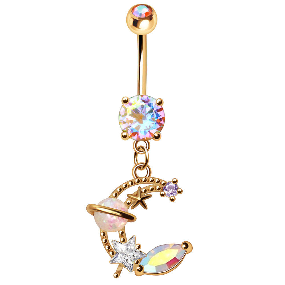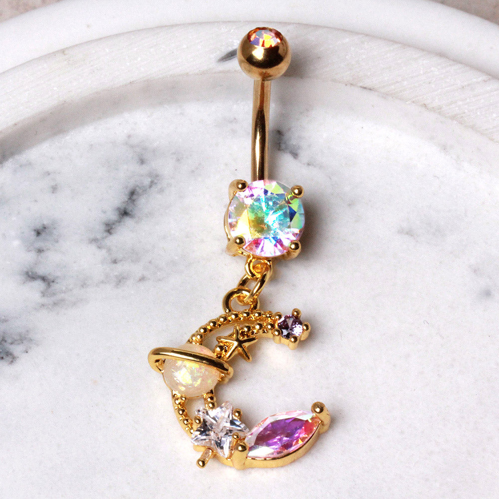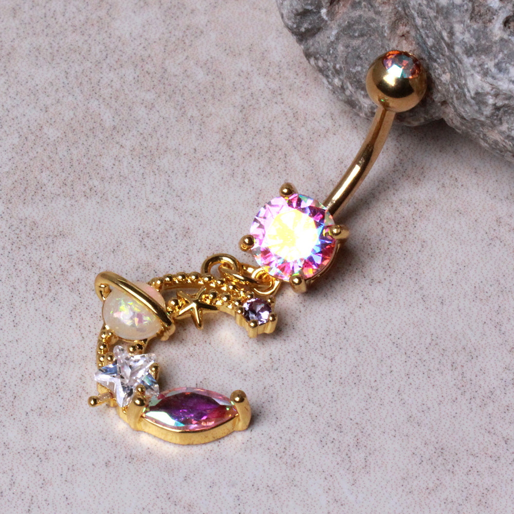 Aurora Borealis CZ Crystal Galaxy Crescent Moon Dangling Belly Button Ring - Gold Plated 316L Stainless Steel