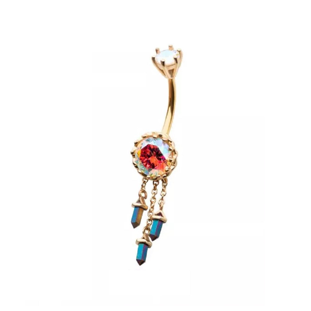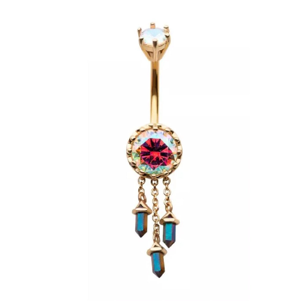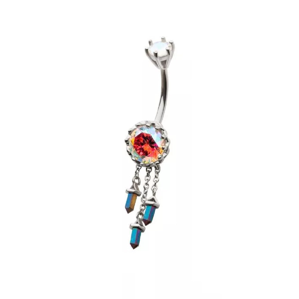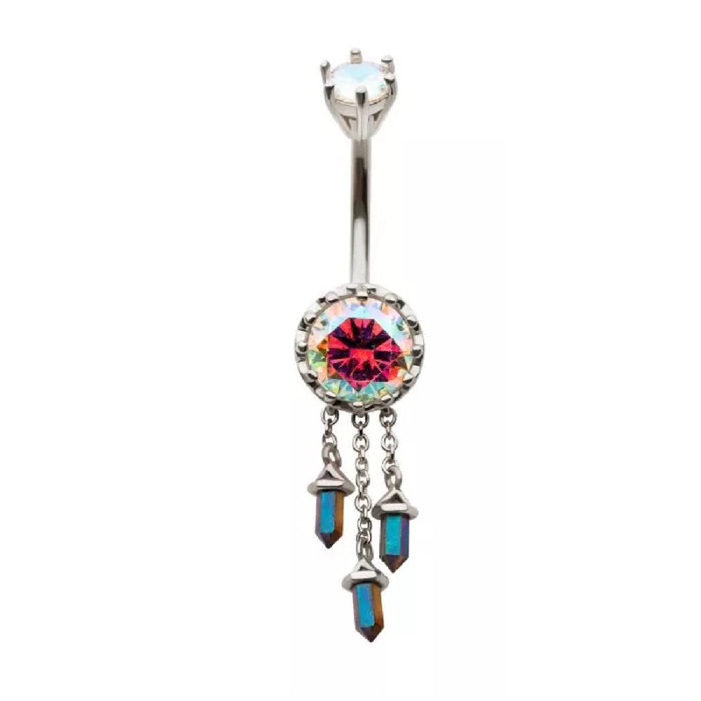 Aurora Borealis Gem with Triple Dangling Charms Belly Button Ring - 316L Stainless Steel