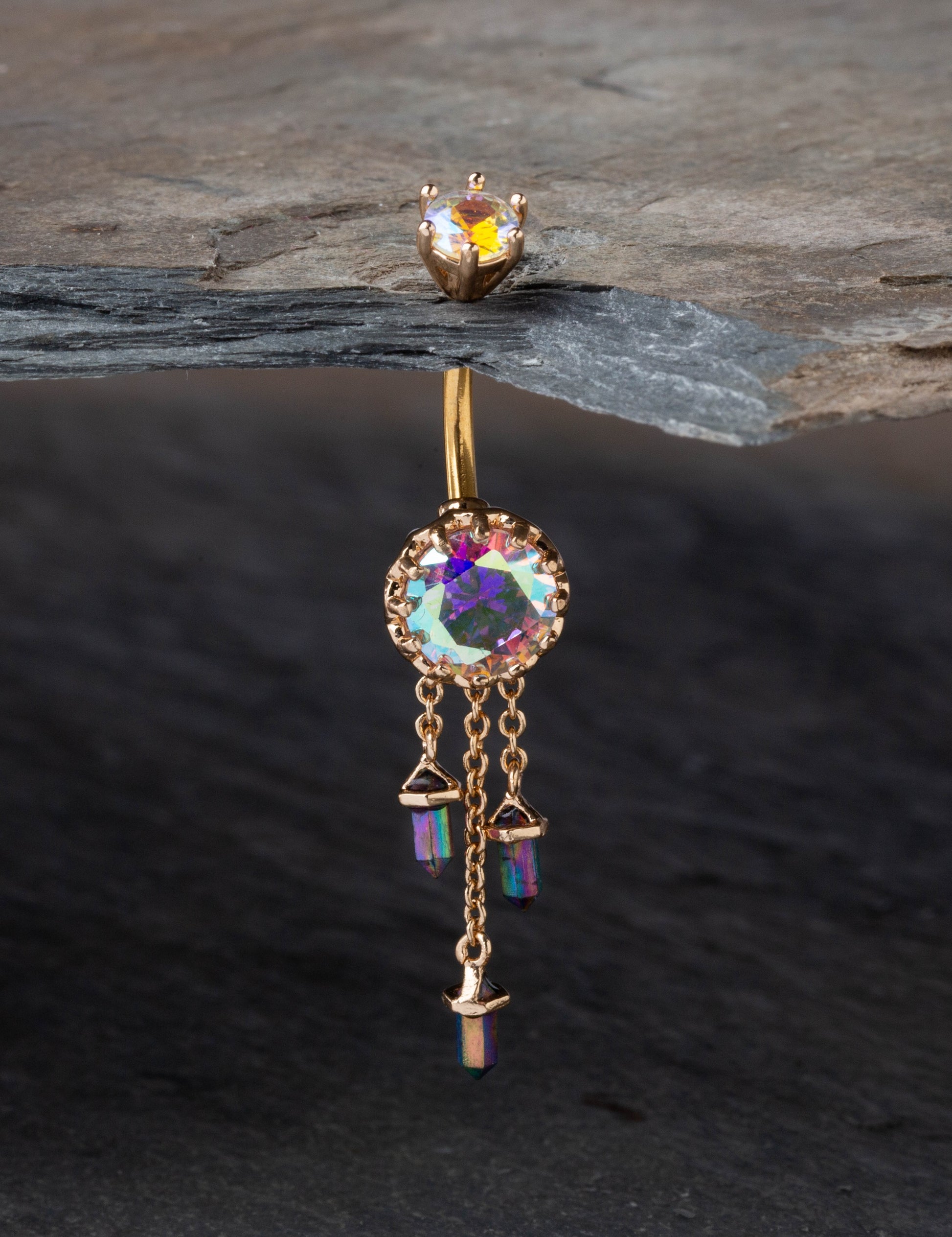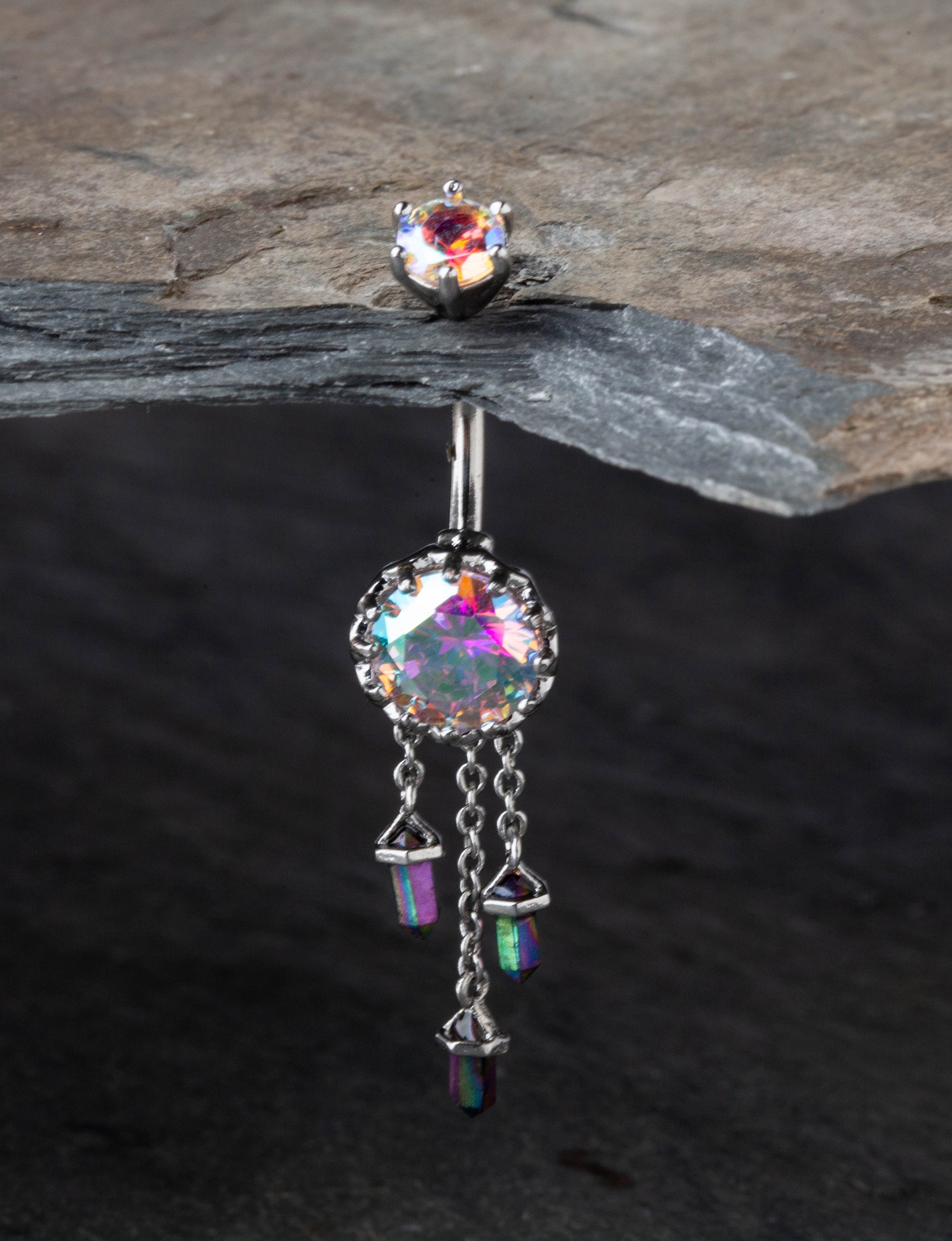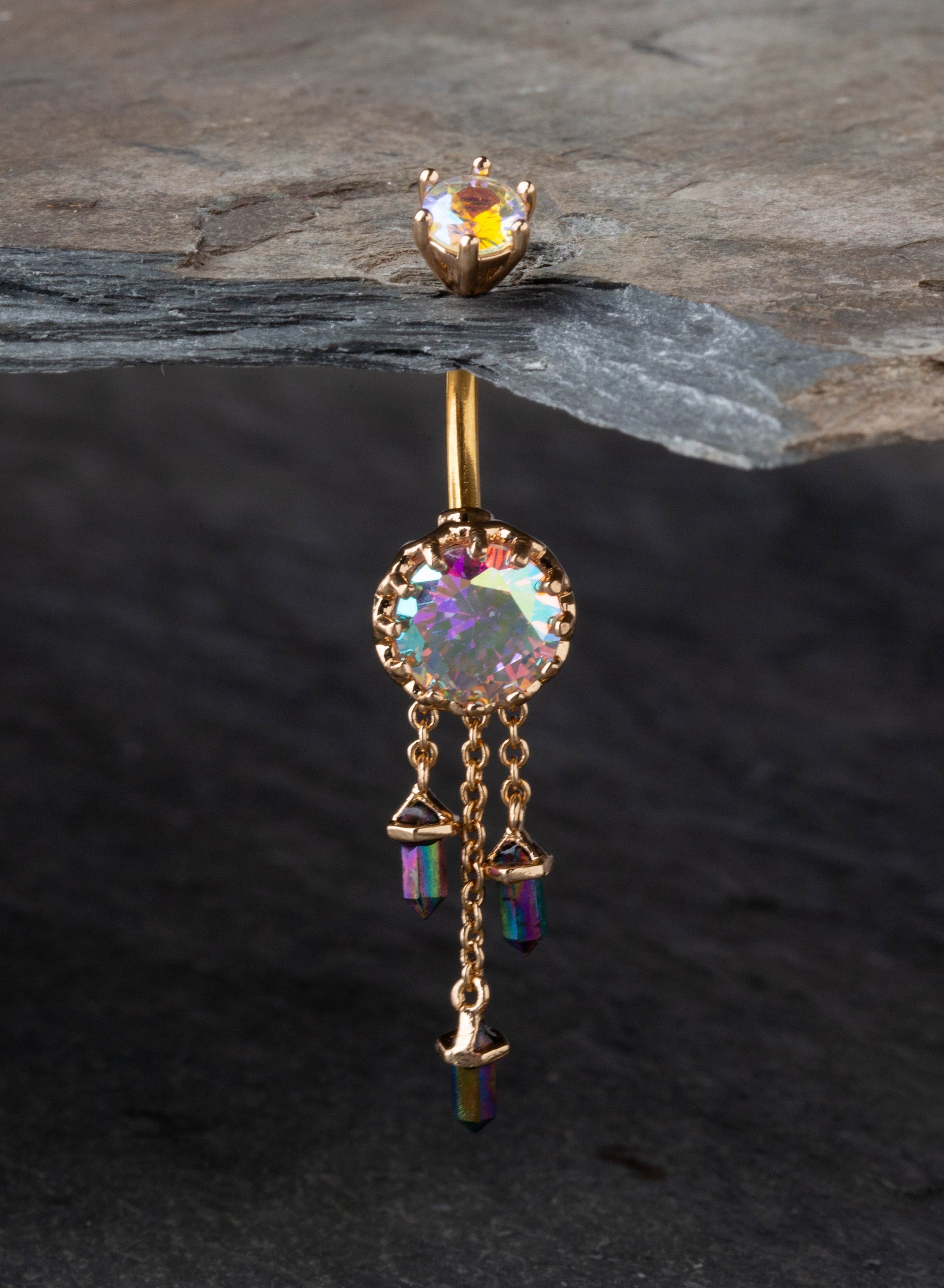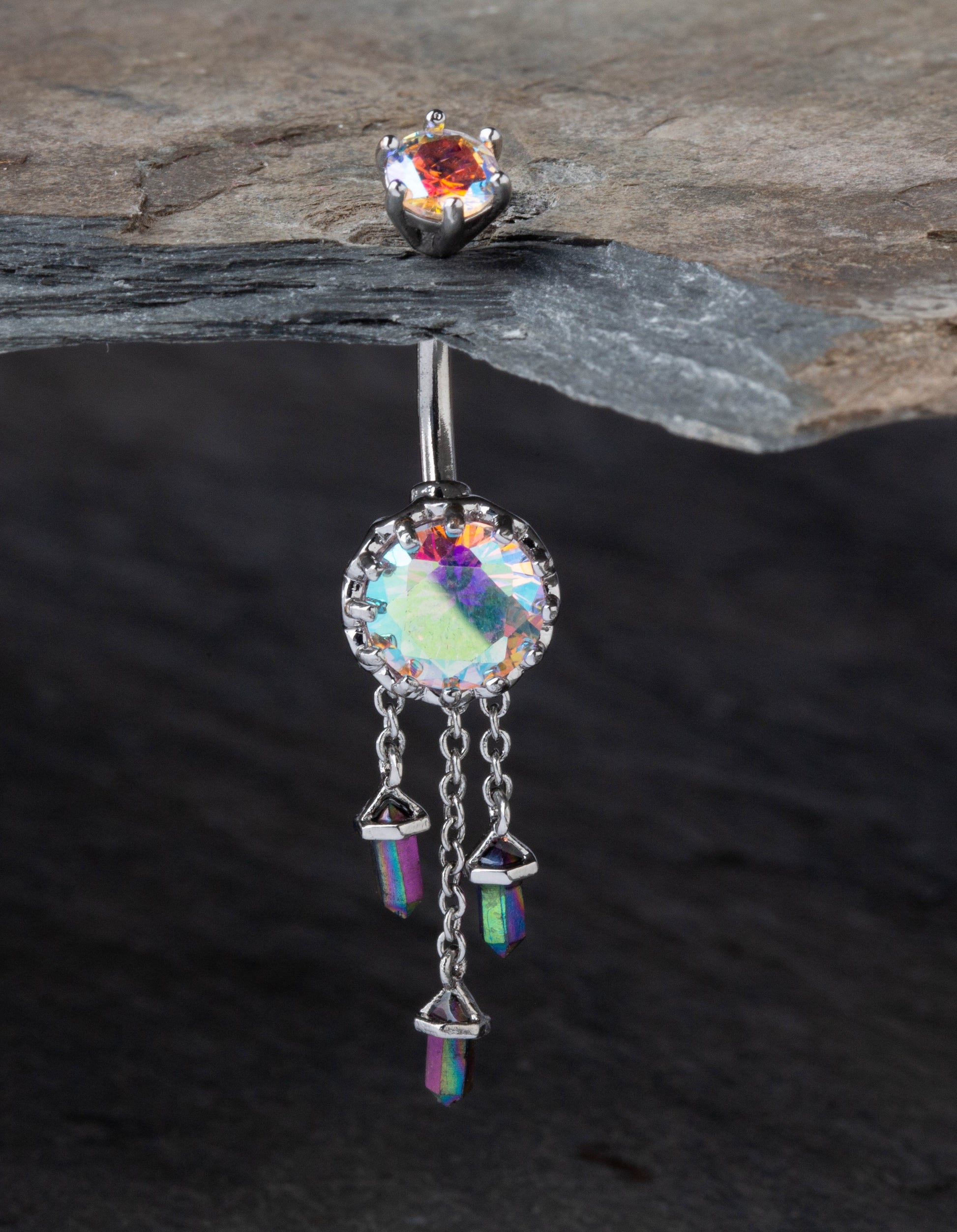 Aurora Borealis Gem with Triple Dangling Charms Belly Button Ring - 316L Stainless Steel