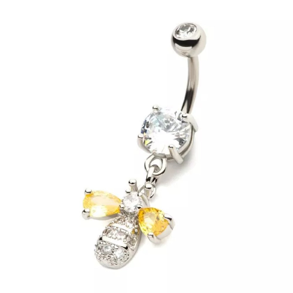 Bee with Yellow CZ Crystal Wings Dangling Belly Button Ring - 316L Stainless Steel
