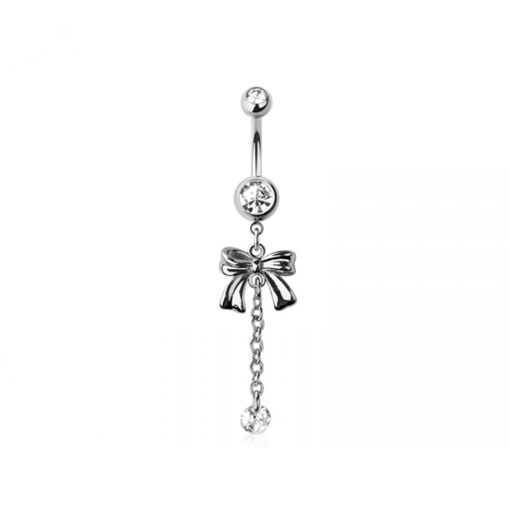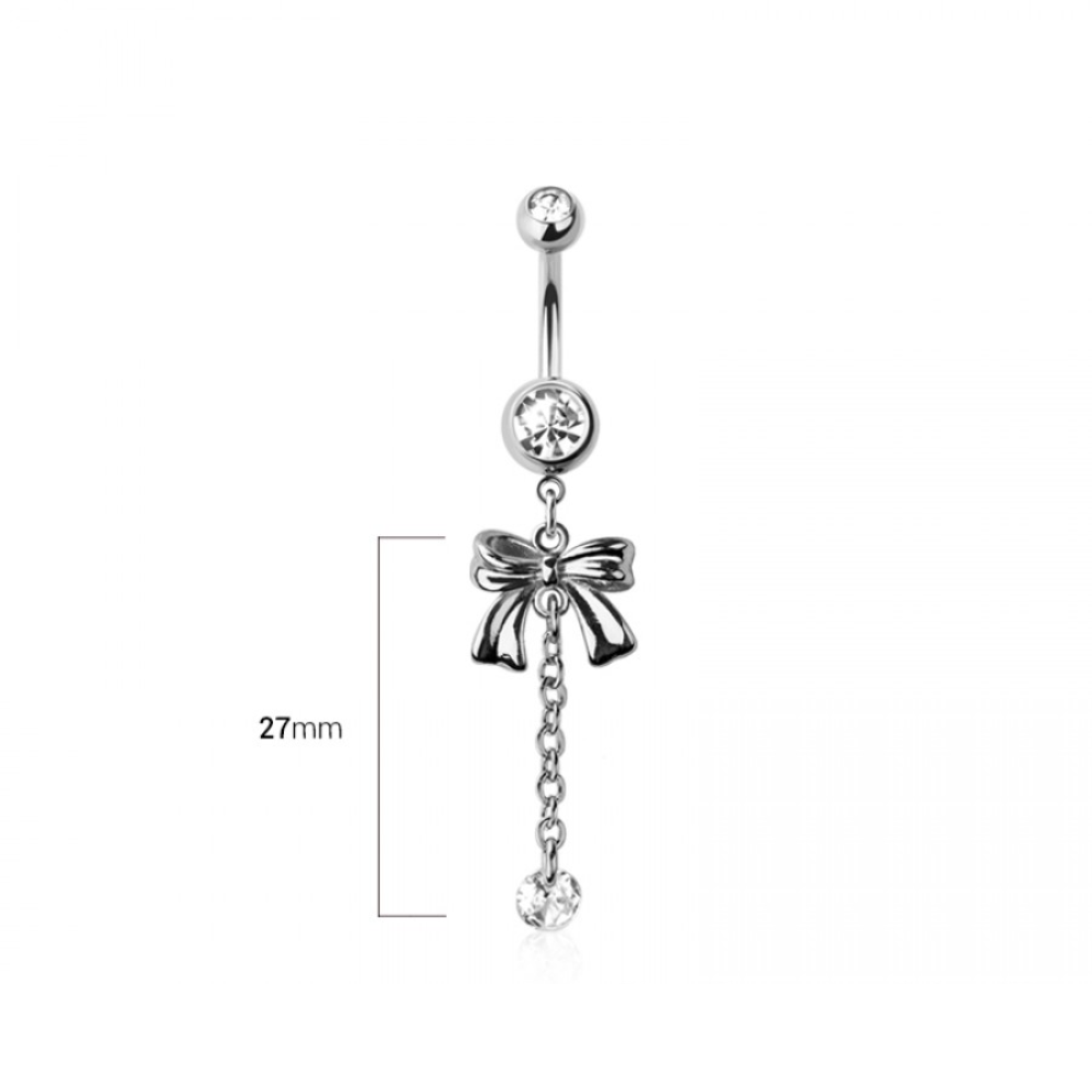 CZ Crystal Bow with Dangling Chain and Gem Belly Button Ring - 316L Stainless Steel