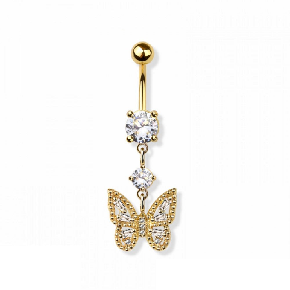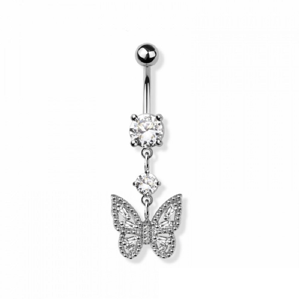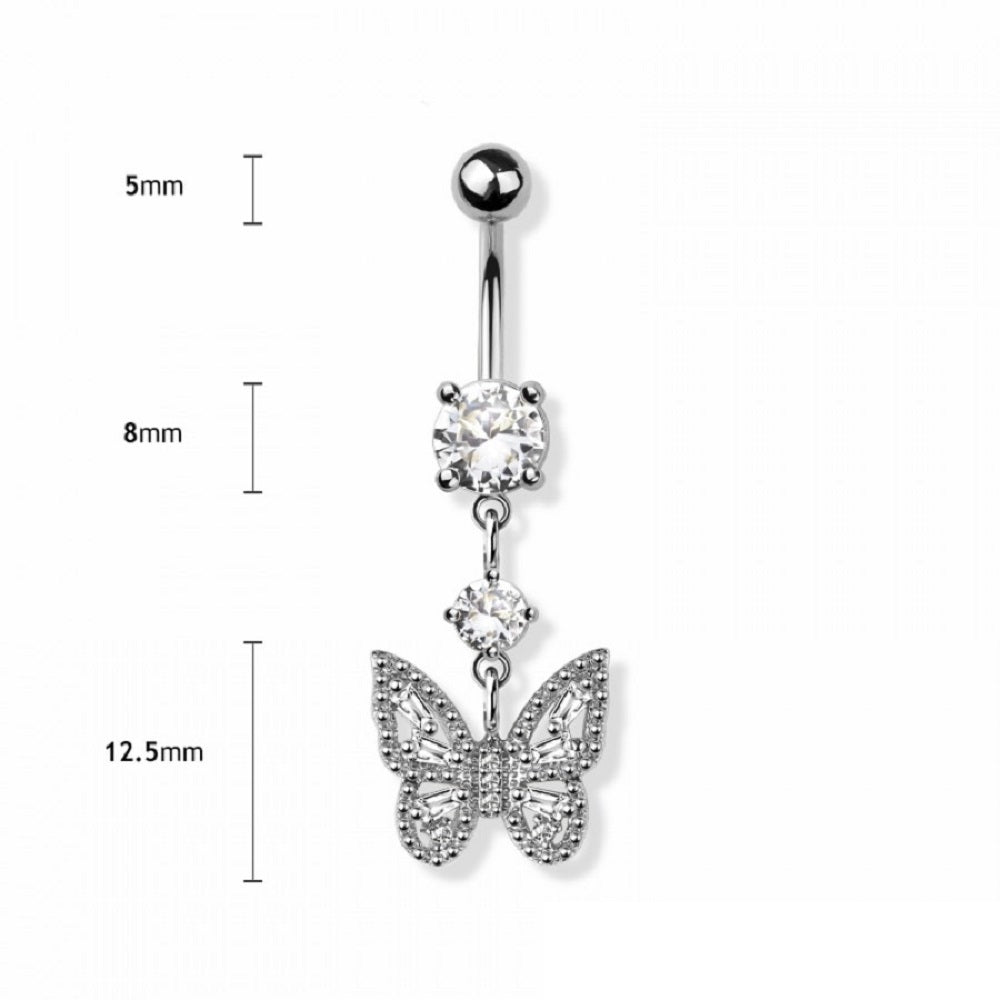 CZ Crystal Butterfly Dangling Belly Button Ring - 316L Stainless Steel