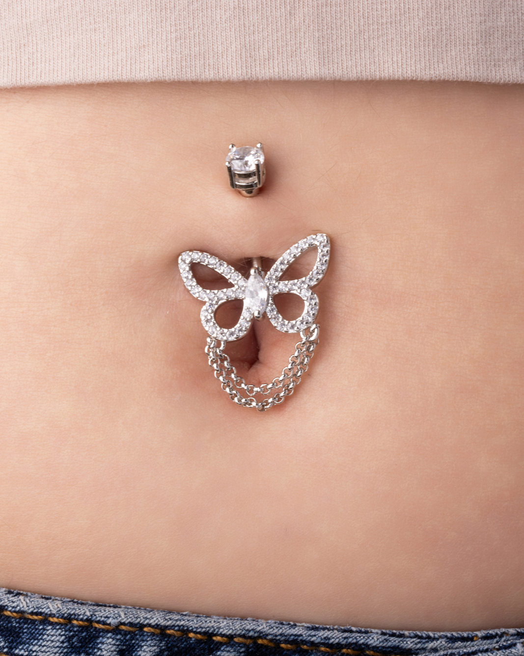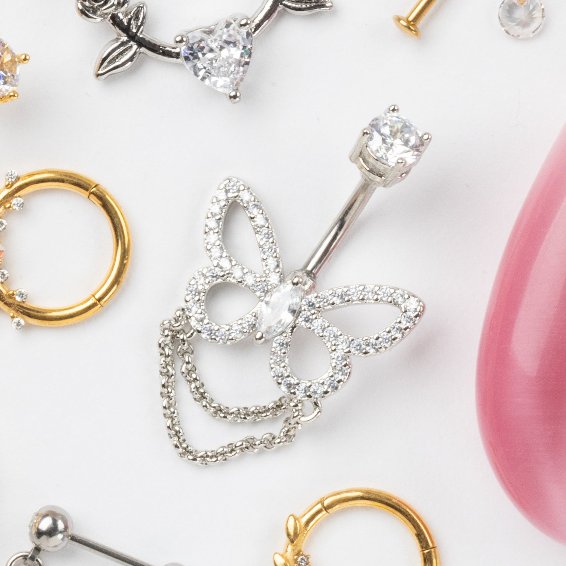 CZ Crystal Butterfly with Dangling Chains Belly Button Ring - 316L Stainless Steel