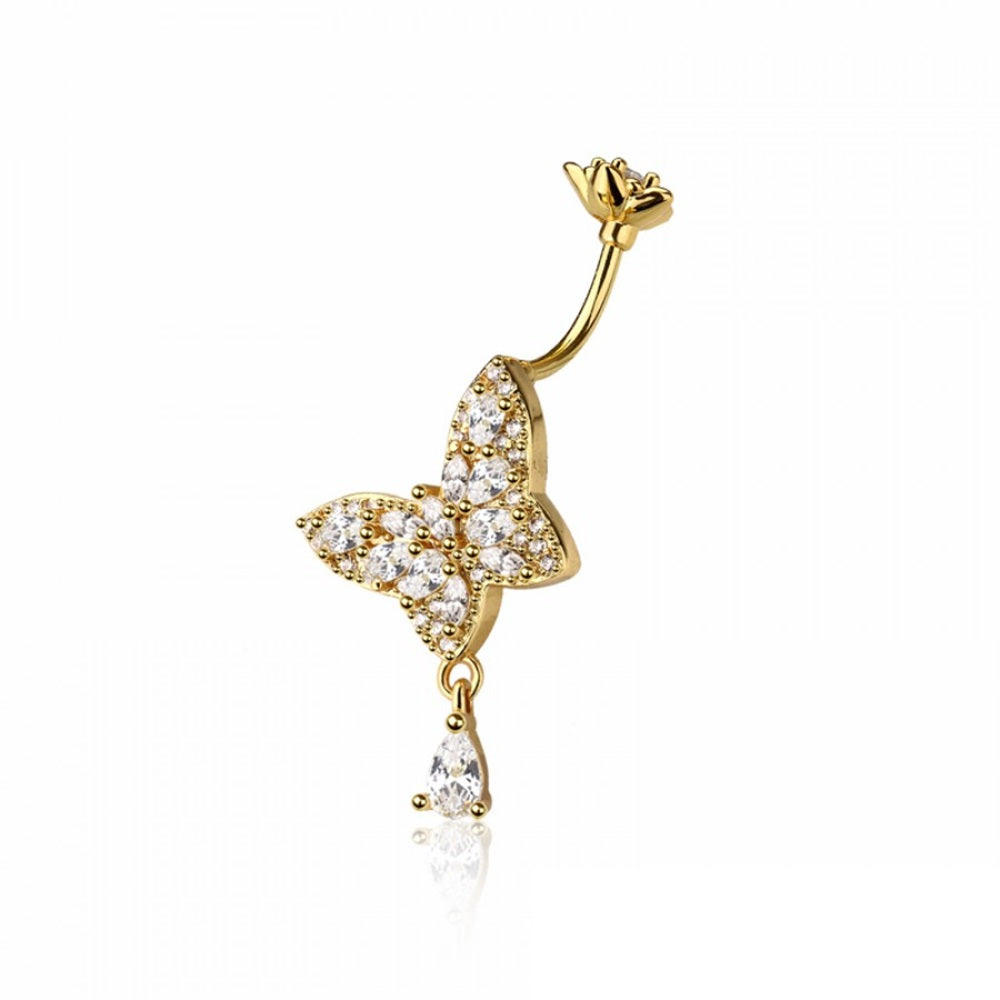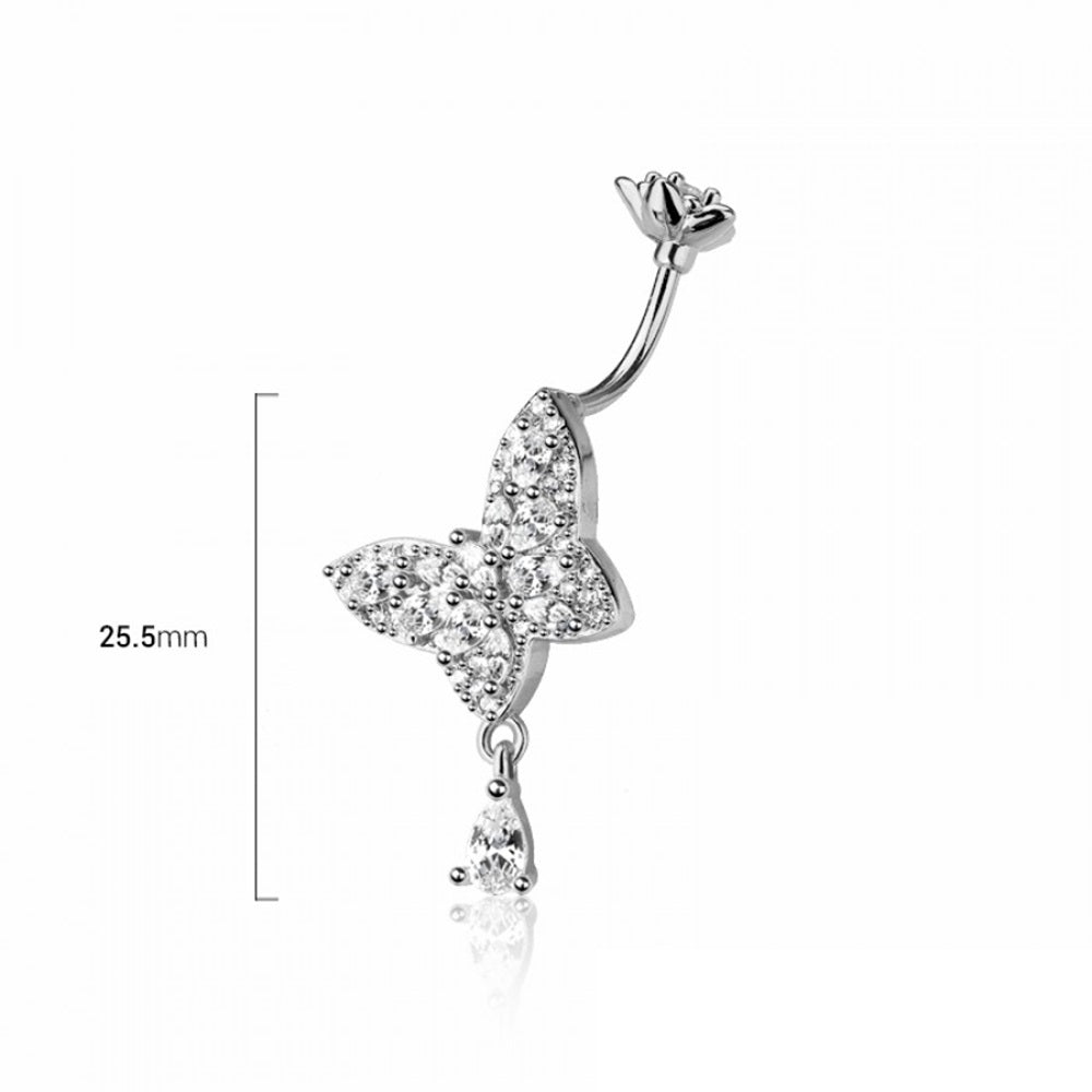CZ Crystal Butterfly with Dangling Teardrop Belly Button Ring - 316L Stainless Steel