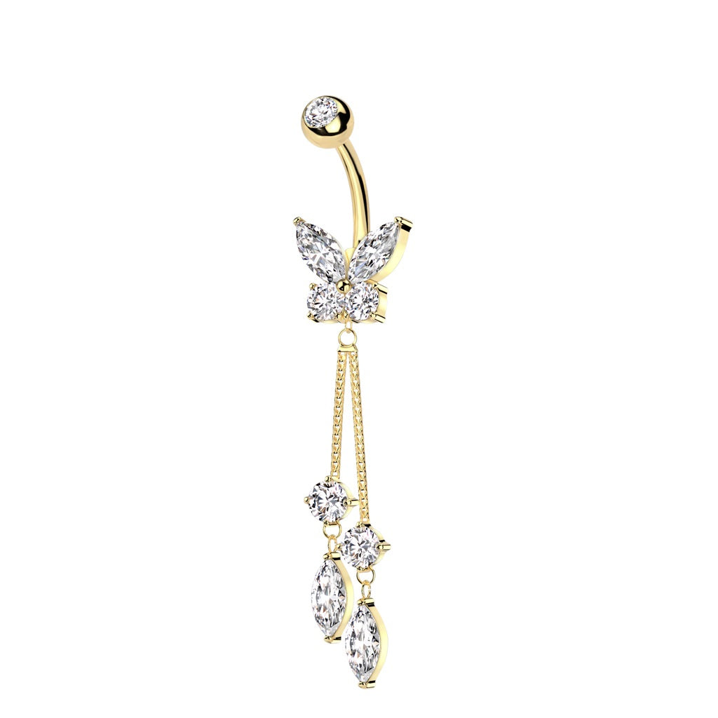 CZ Crystal Butterfly with Double Dangling Marquise Belly Button Ring - 316L Stainless Steel