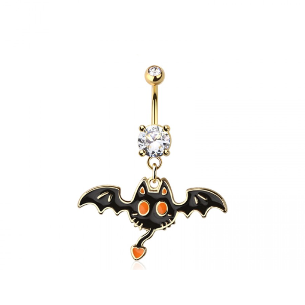 CZ Crystal Cat Bat Dangling Belly Button Ring - Gold Plated 316L Stainless Steel