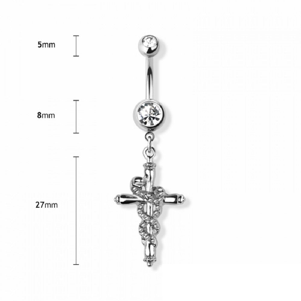 CZ Crystal Cross with Snake Dangling Belly Button Ring - 316L Stainless Steel