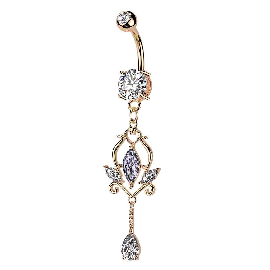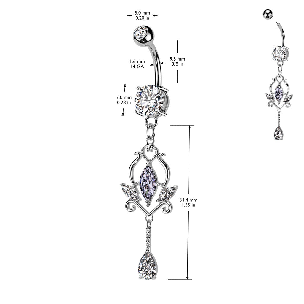 CZ Crystal Floral Marquise Dangling Belly Button Ring - 316L Stainless Steel