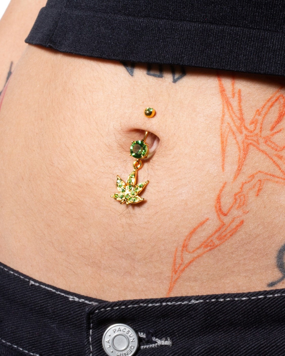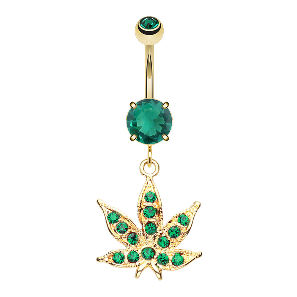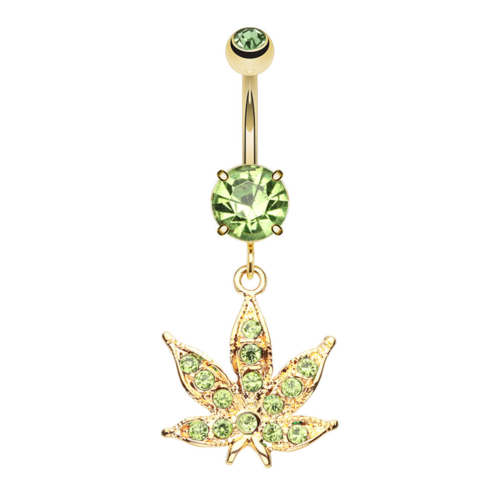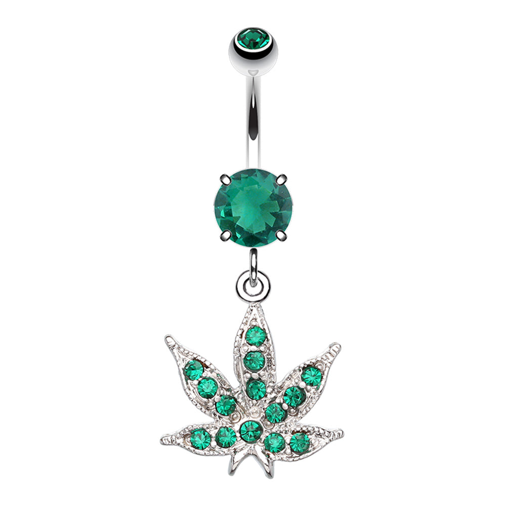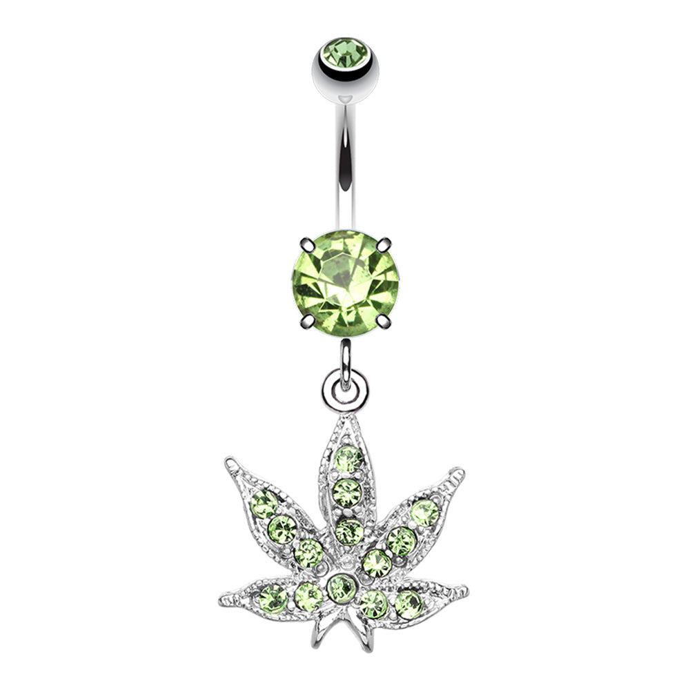 CZ Crystal Green Pot Leaf Dangling Belly Button Ring - Stainless Steel