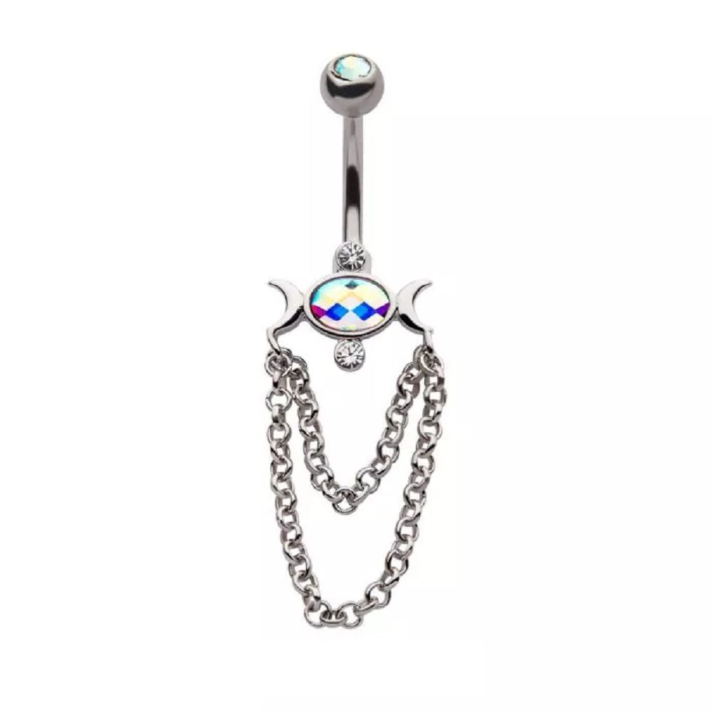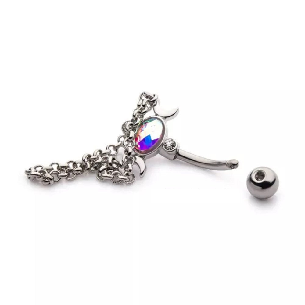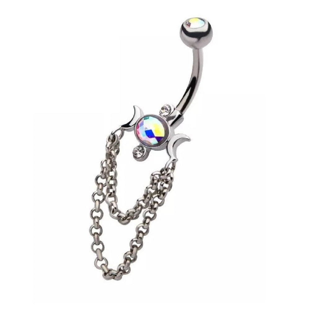 Double Crescent Moons with Dangle Chains Belly Button Ring - 316L Stainless Steel