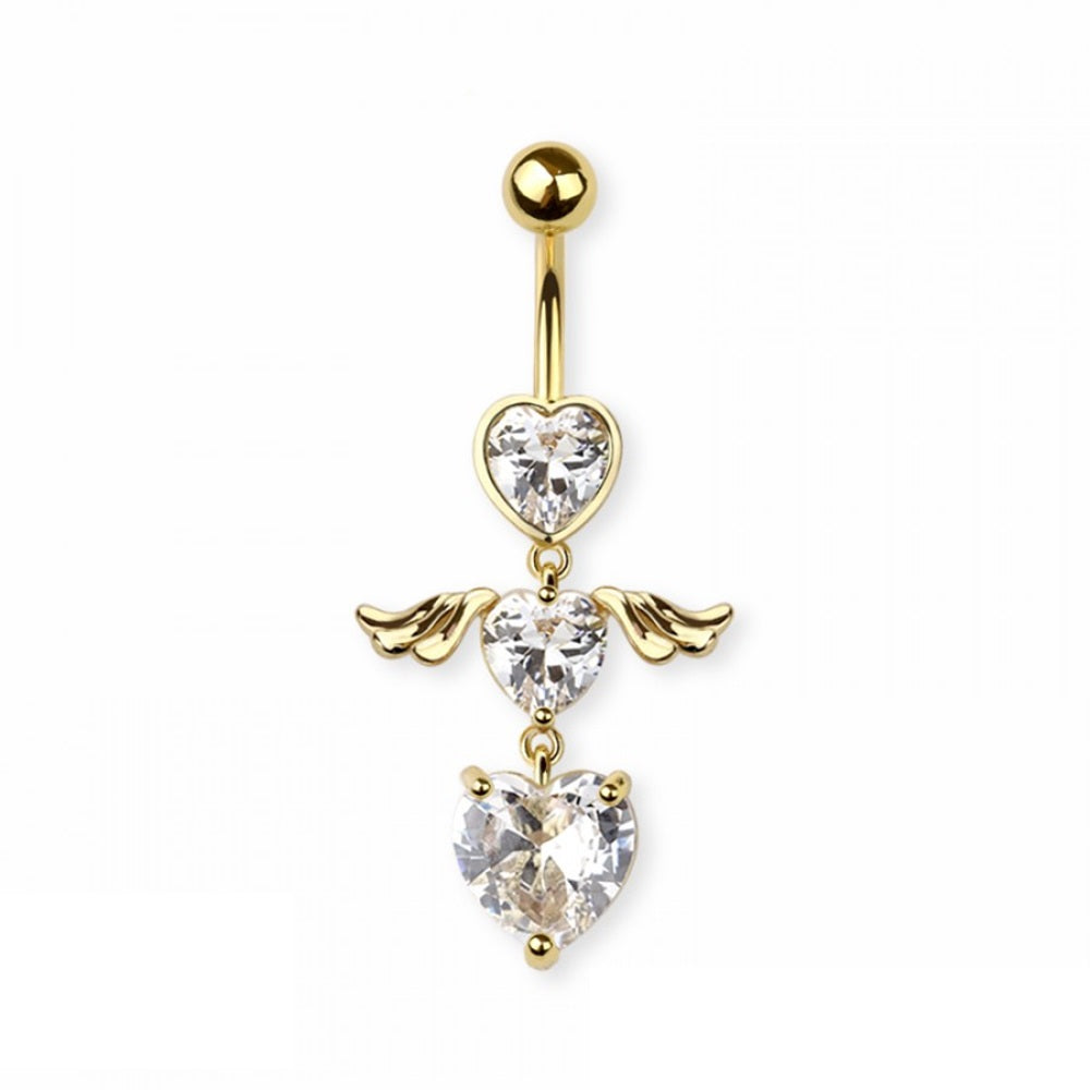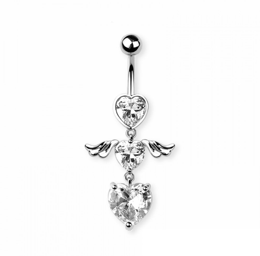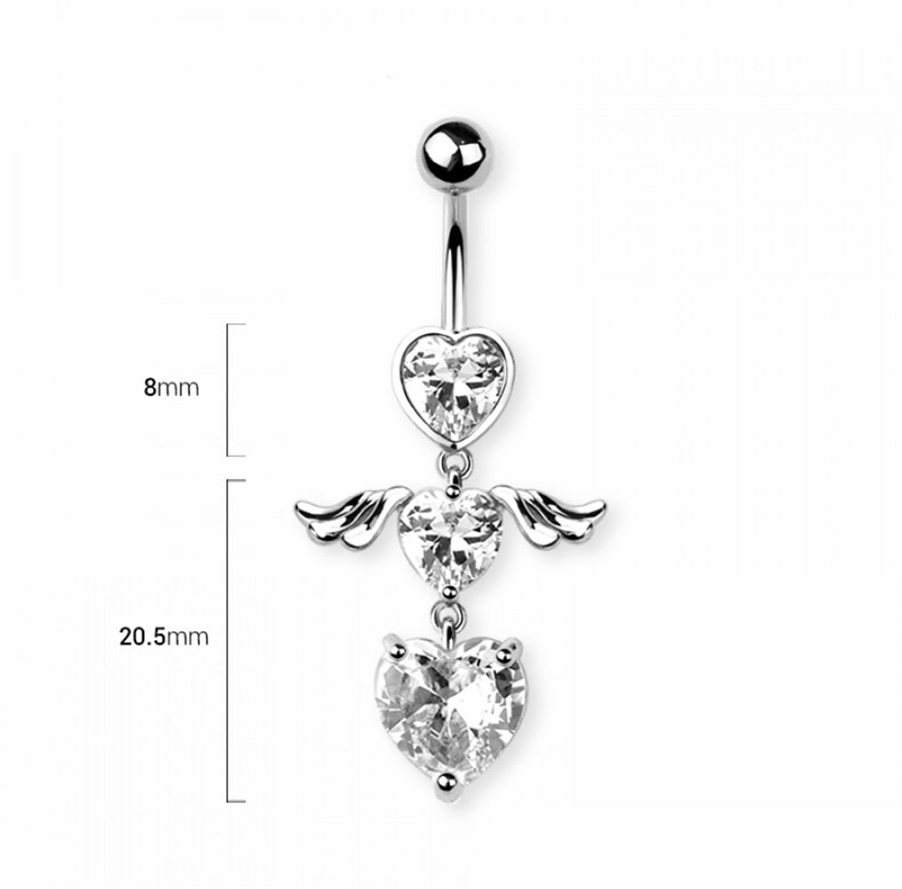 Double CZ Crystal Heart with Wings Dangling Belly Button Ring - 316L Stainless Steel