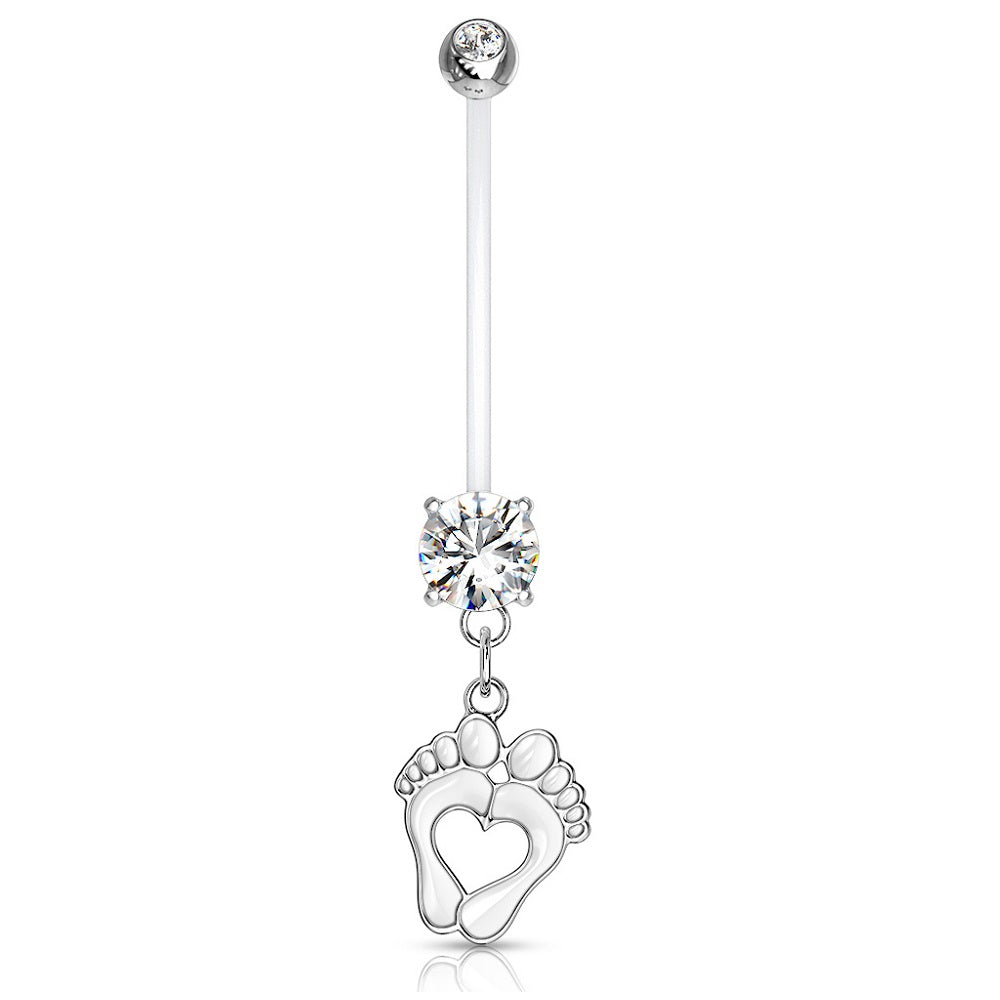 Double Jeweled Heart Baby Feet Dangle Pregnancy Maternity Belly Button Ring Retainer - Stainless Steel