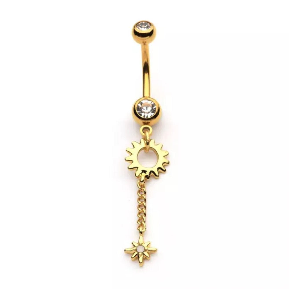 Gold Tone Sun with Chain and Opalite Star Dangling Belly Button Ring - 316L Stainless Steel