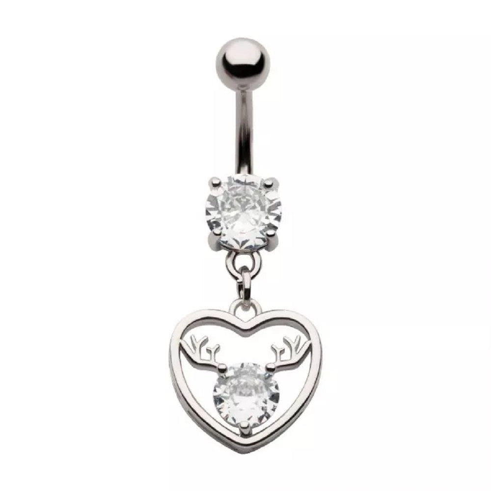 Heart Outline with CZ Crystal Antlers Dangling Belly Button Ring - 316L Stainless Steel