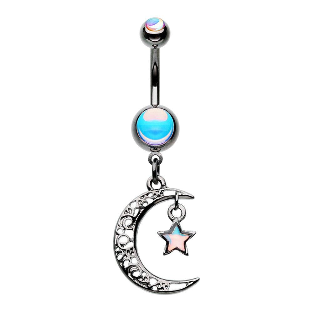 Holographic Hematite Filigree Moon and Star Dangle Belly Button Ring - Stainless Steel
