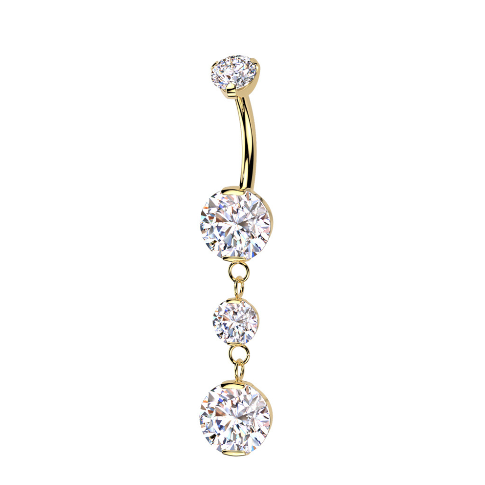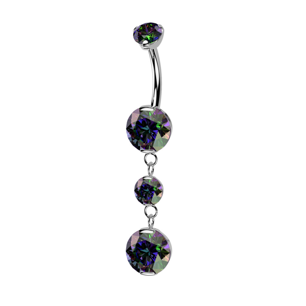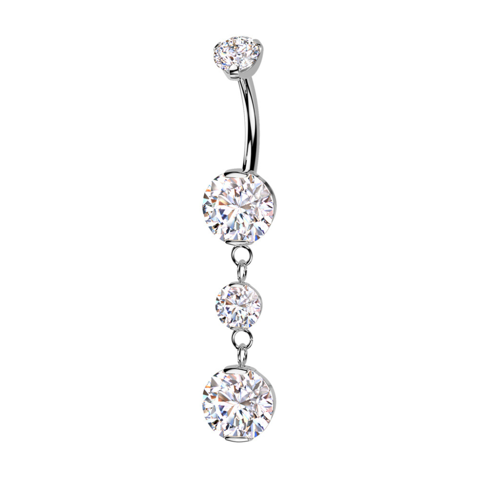 Internally Threaded Double Prong CZ Crystal with Two Round CZ Crystals Dangling Belly Button Ring - ASTM F-136 Implant Grade Titanium
