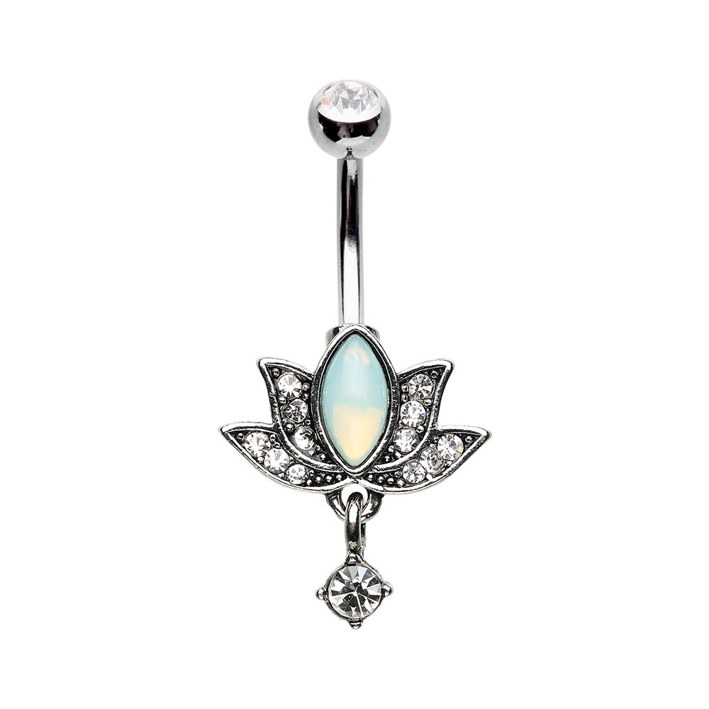 Opalite Lotus with Dangling Gem Belly Button Ring - 316L Stainless Steel