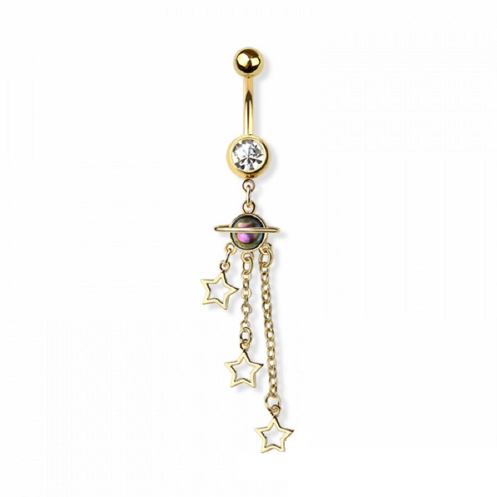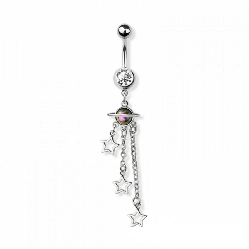 Planet with Triple Chain Dangling Stars Belly Button Ring - 316L Stainless Steel