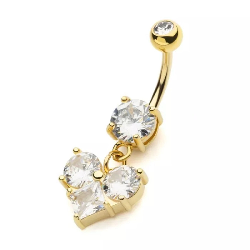 Prong Set CZ Crystal Heart Dangling Belly Button Ring - Gold Plated 316L Stainless Steel