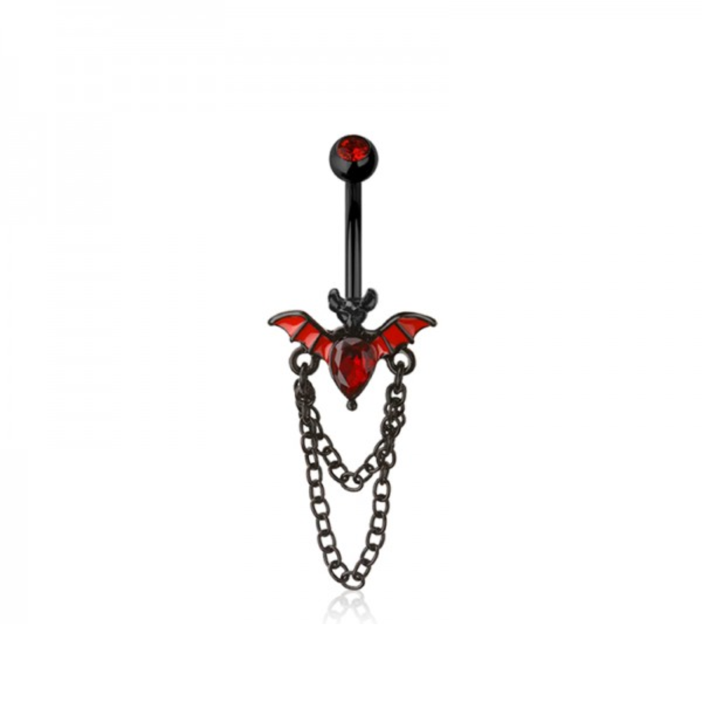 Red CZ Crystal Bat with Dangling Chains Belly Button Ring - Black 316L Stainless Steel