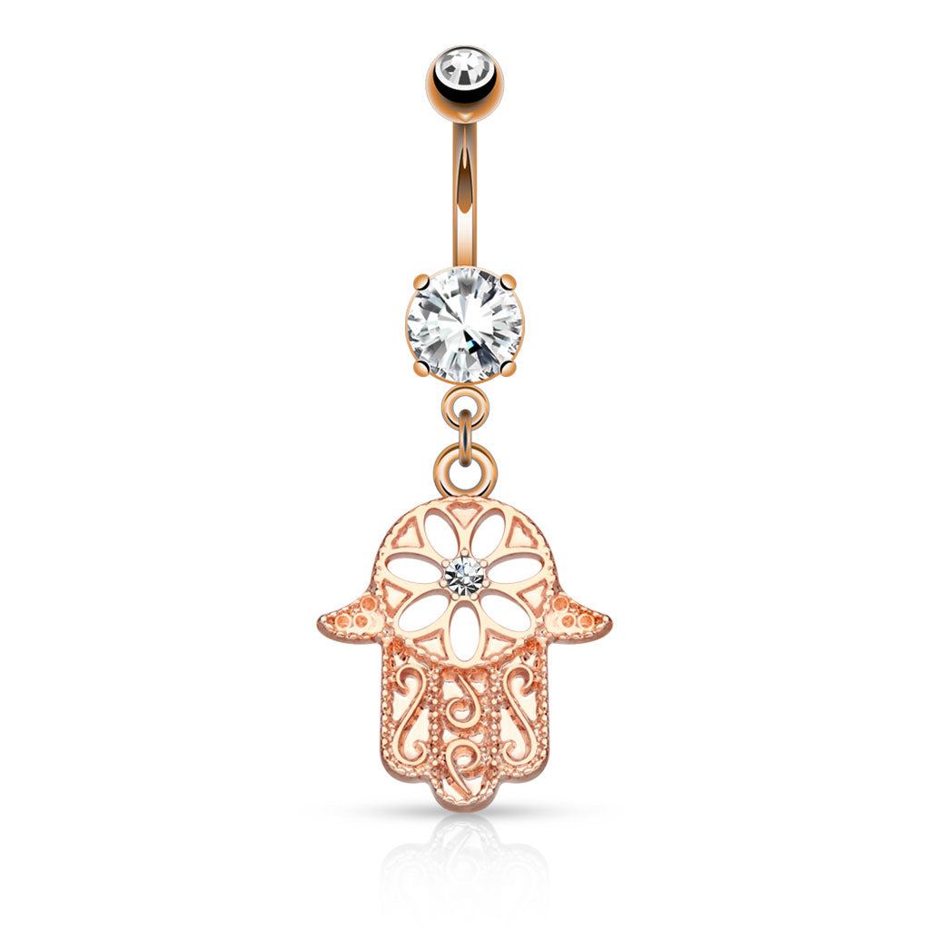 Beaded Outline Hamsa Hand with CZ Crystal Center Dangling Belly Button Ring - Stainless Steel