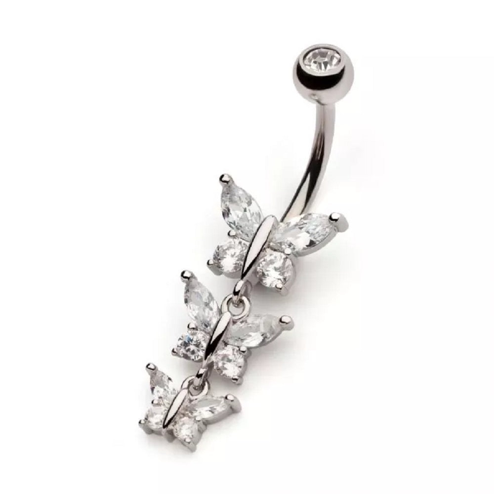 Triple CZ Crystal Butterflies Dangling Belly Button Ring - 316L Stainless Steel