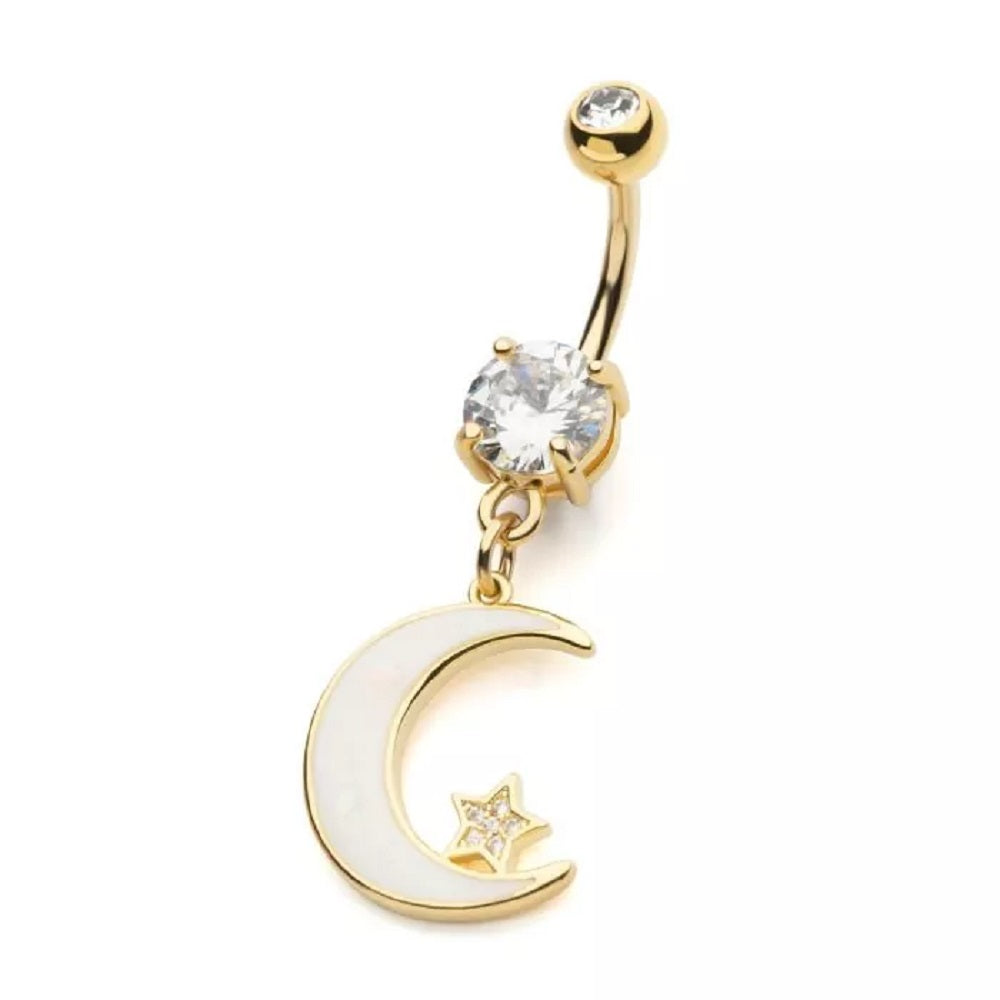 White Opalite Crescent Moon Dangling Belly Button Ring - Gold Plated 316L Stainless Steel