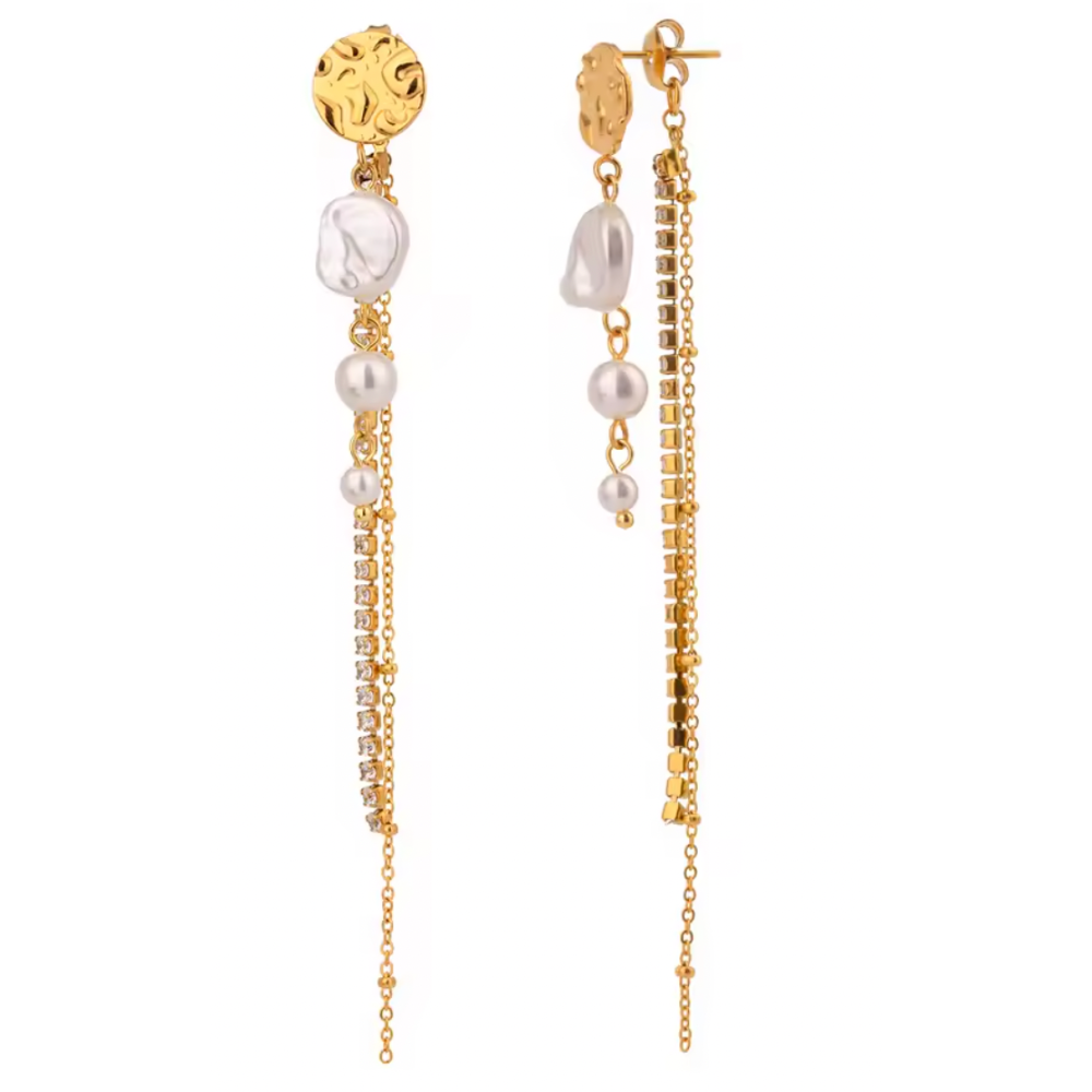 Synthetic Pearl and CZ Crystal Chain Drop Earrings - Pair - Gold Plated Stainless Steel