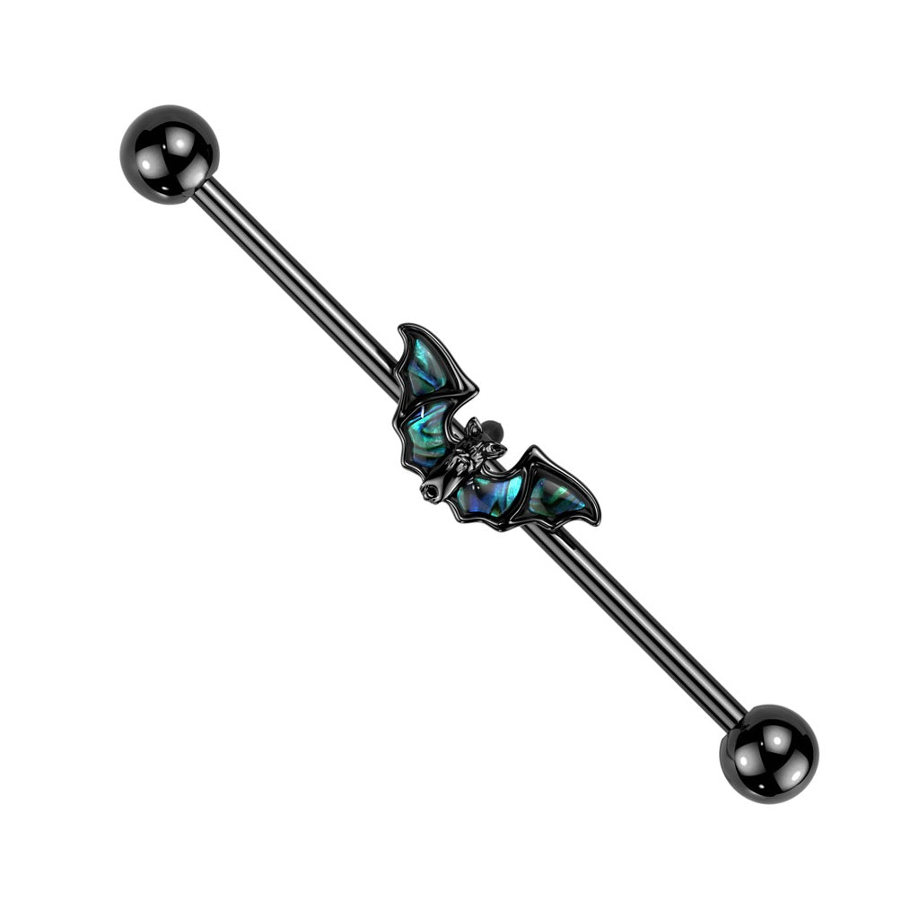 Black PVD Plated Bat with Abalone Wings Industrial Barbell - 316L Stainless Steel