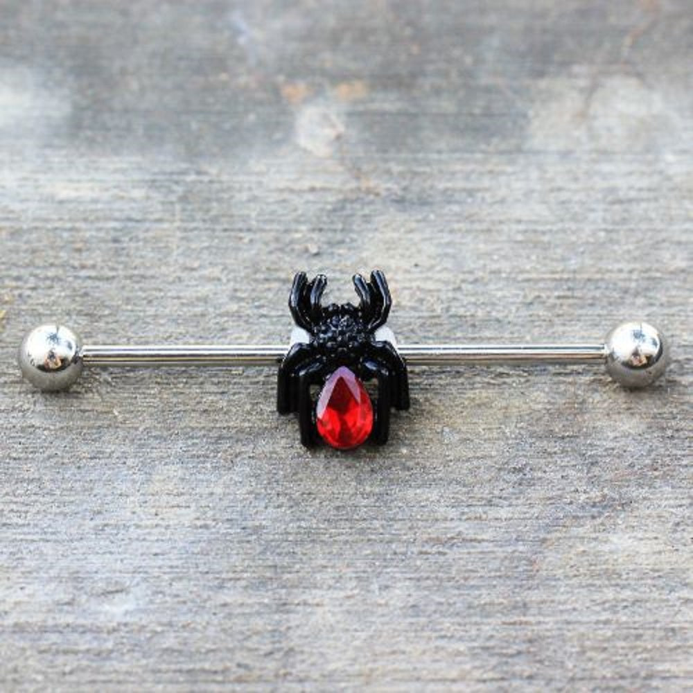 Black Spider with Red CZ Crystal Industrial Barbell - Stainless Steel