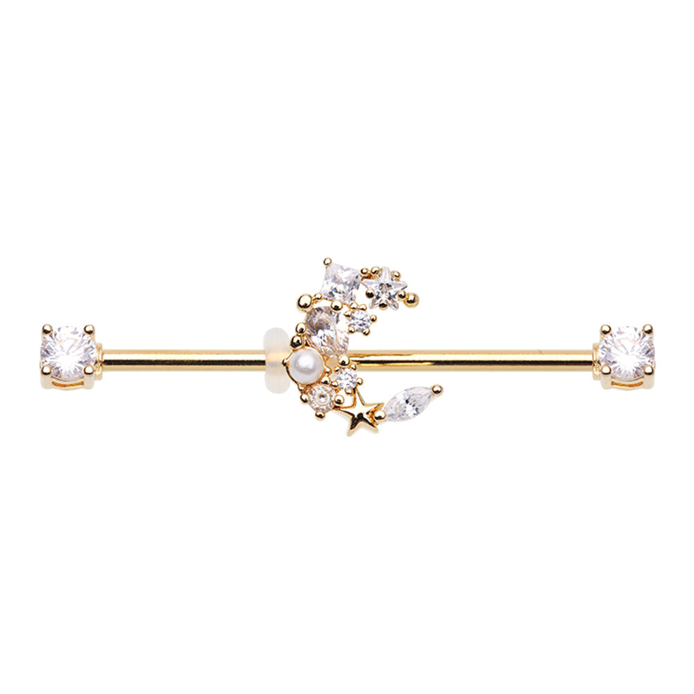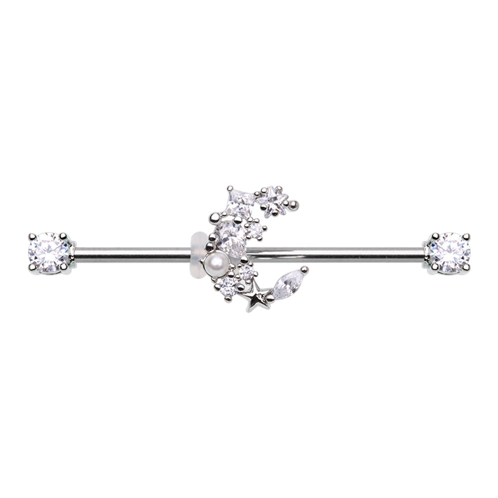CZ Crystal and Faux Pearl Crescent Moon Industrial Barbell - Stainless Steel