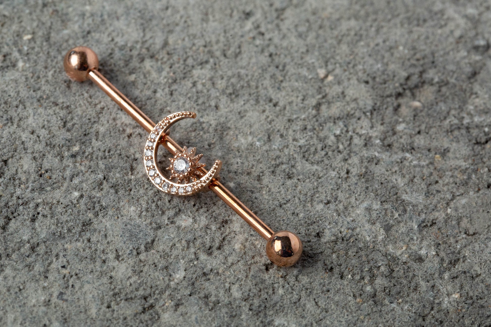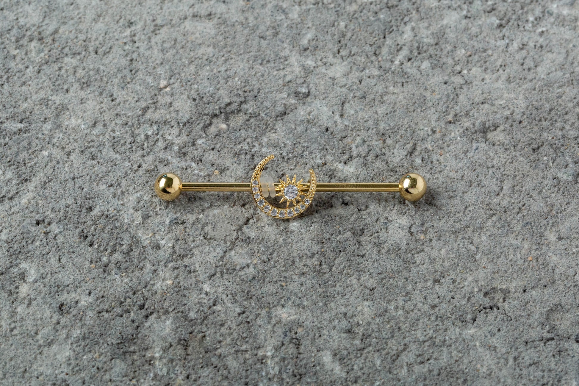 CZ Crystal Paved Crescent Moon and Star Industrial Barbell - 316L Stainless Steel