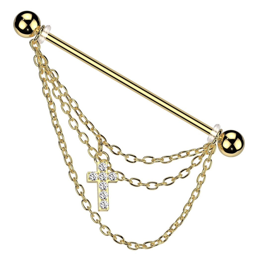 Dangling CZ Crystal Paved Cross and Chains Industrial Barbell - 316L Stainless Steel
