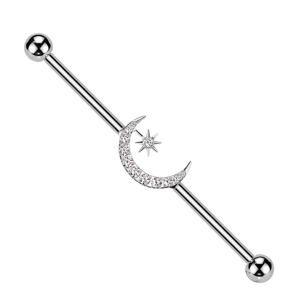 Internally Threaded CZ Crystal Crescent Moon and Star Industrial Barbell - ASTM F-136 Implant Grade Titanium