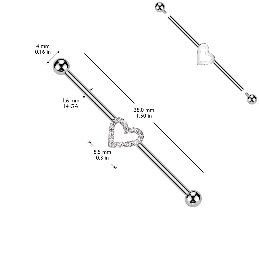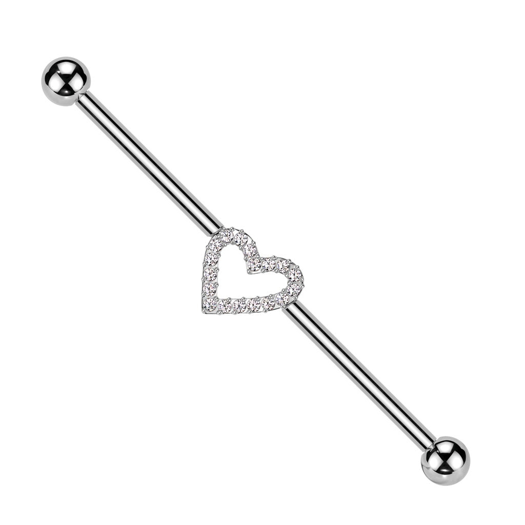 Internally Threaded CZ Crystal Heart Outline Industrial Barbell - ASTM F-136 Implant Grade Titanium