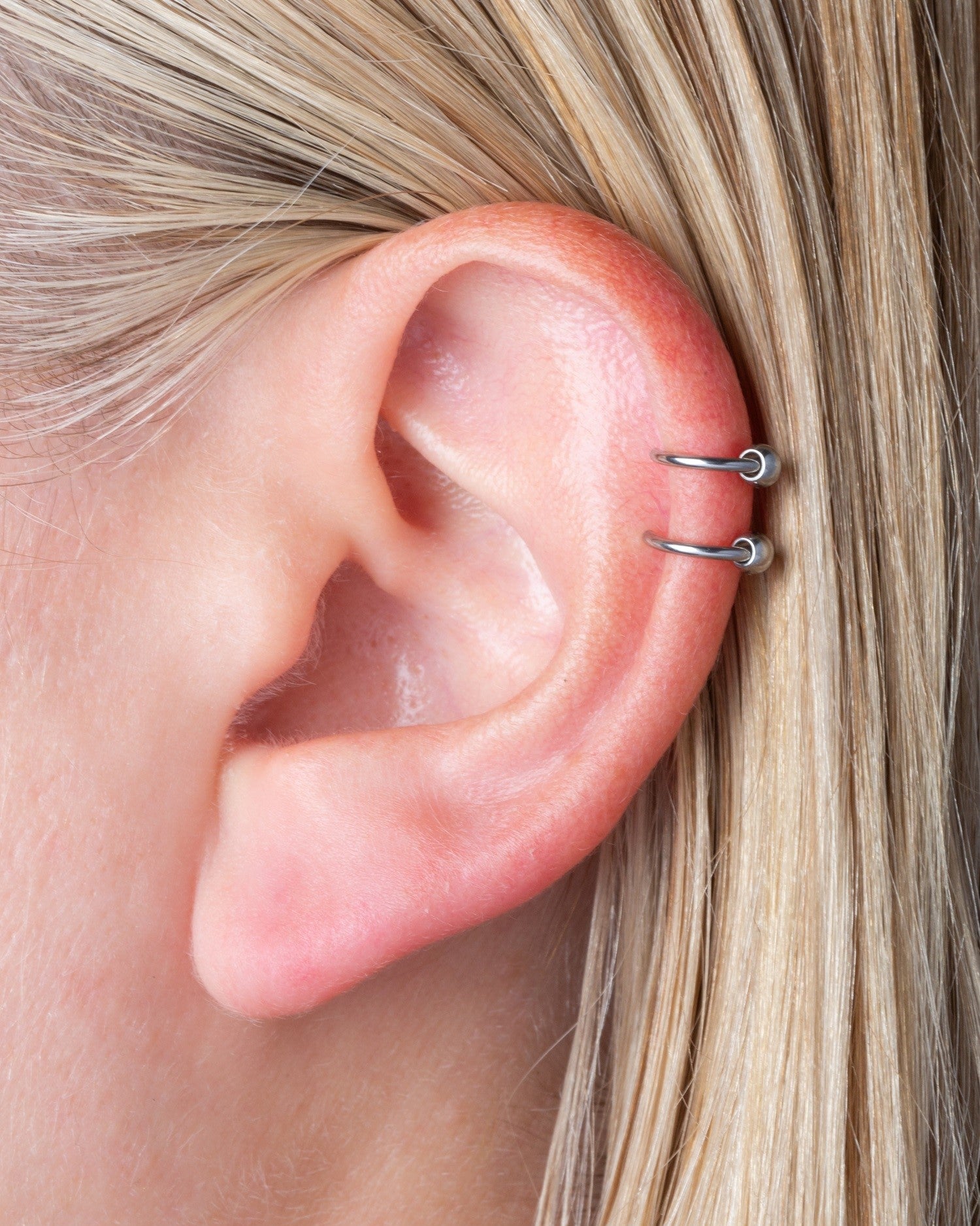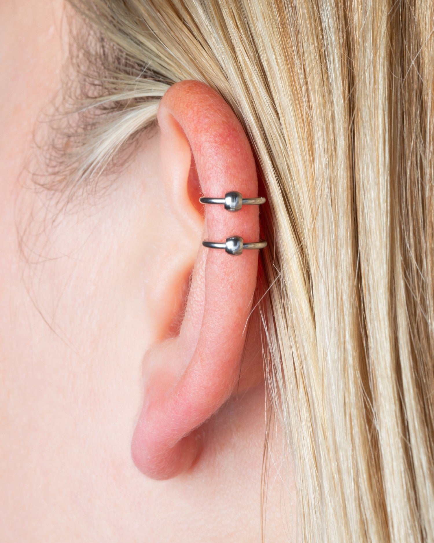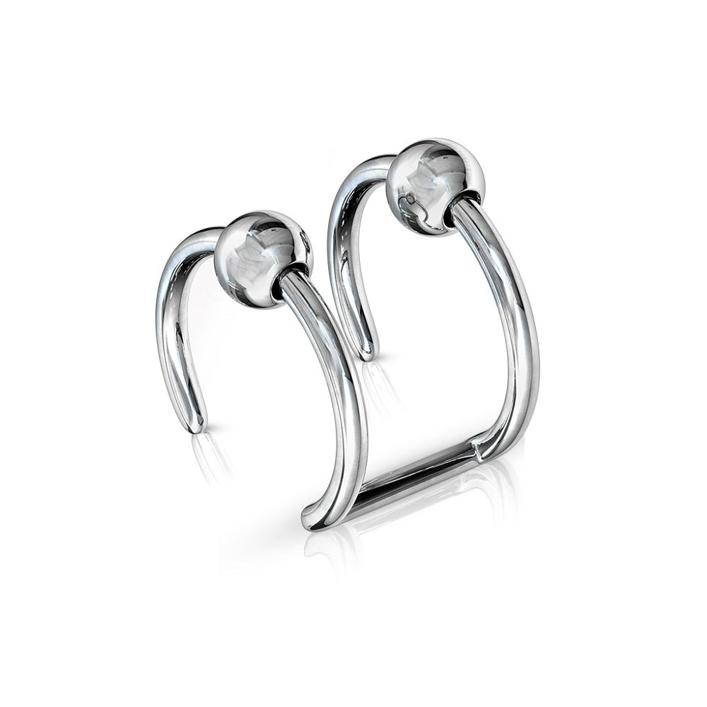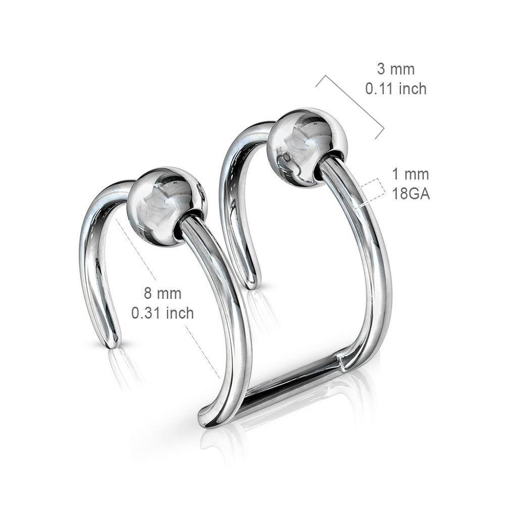 Get the look of 2 18GA captive bead hoops with this double hoop cuff! Can be used for fake cartilage, nose, or lip piercings.