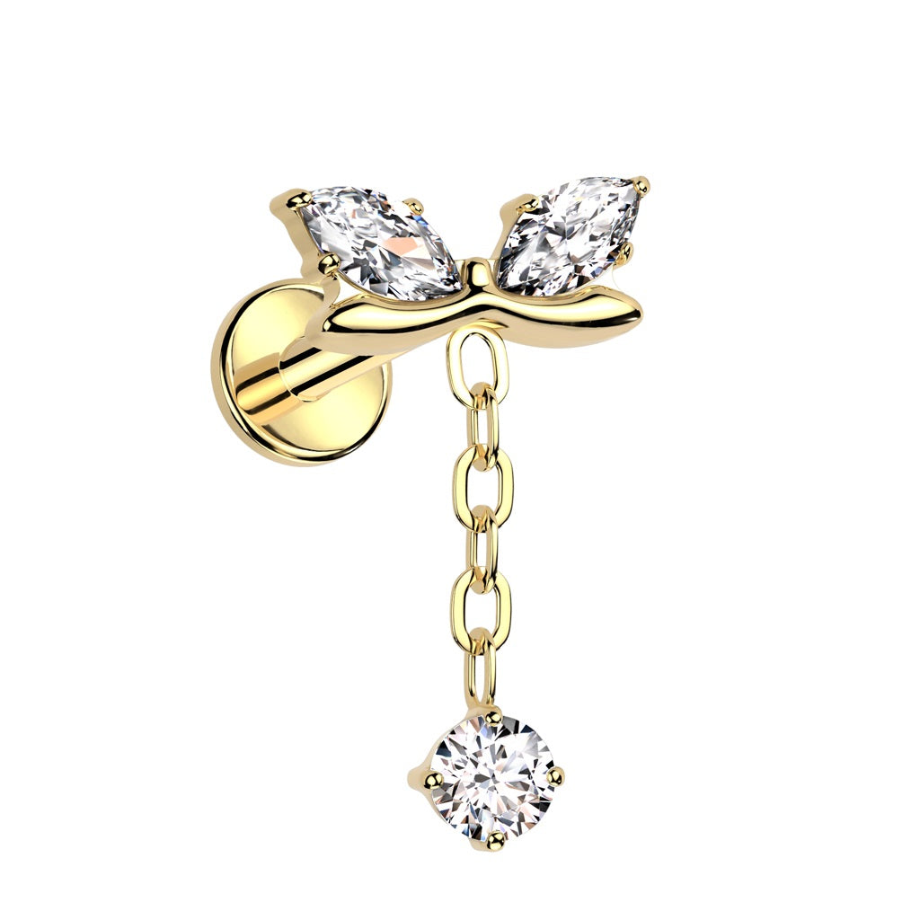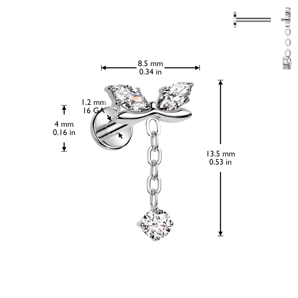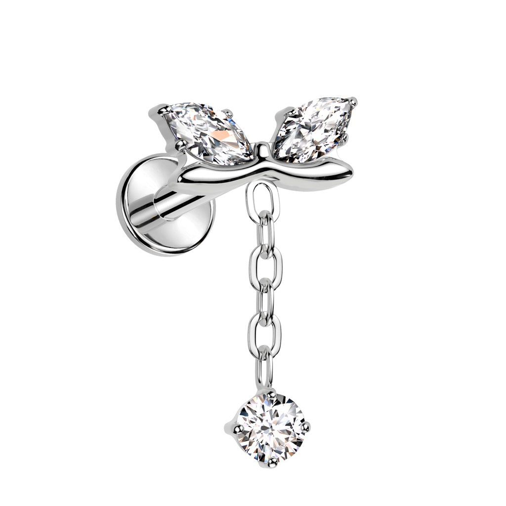 Internally Threaded CZ Crystal Bow with Dangling Gem Chain Flat Back Stud - ASTM F-136 Implant Grade Titanium