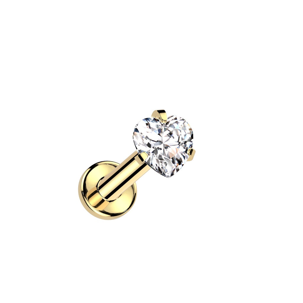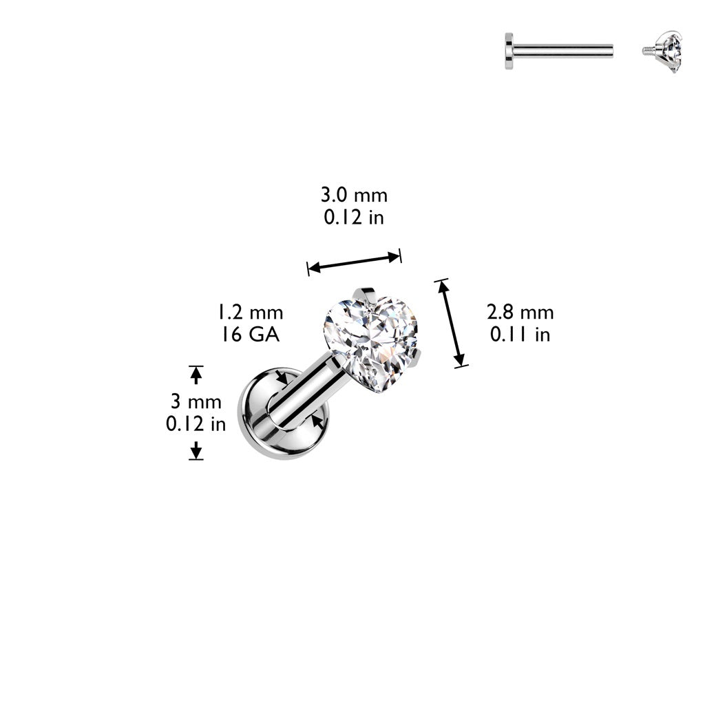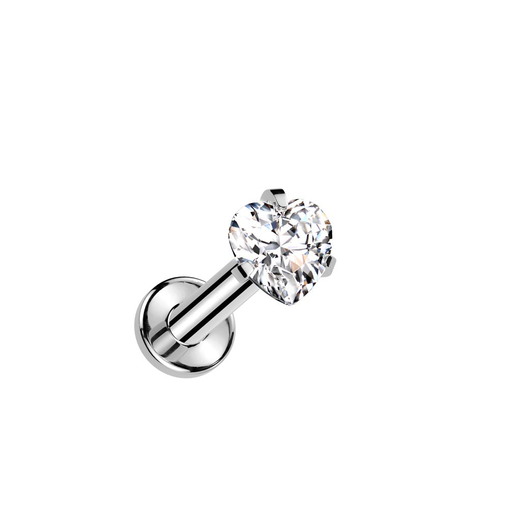 Internally Threaded CZ Crystal Heart Flat Back Stud - ASTM F-136 Implant Grade Titanium
