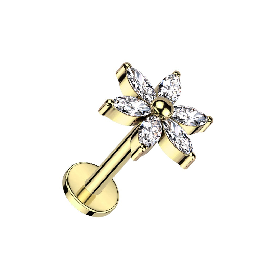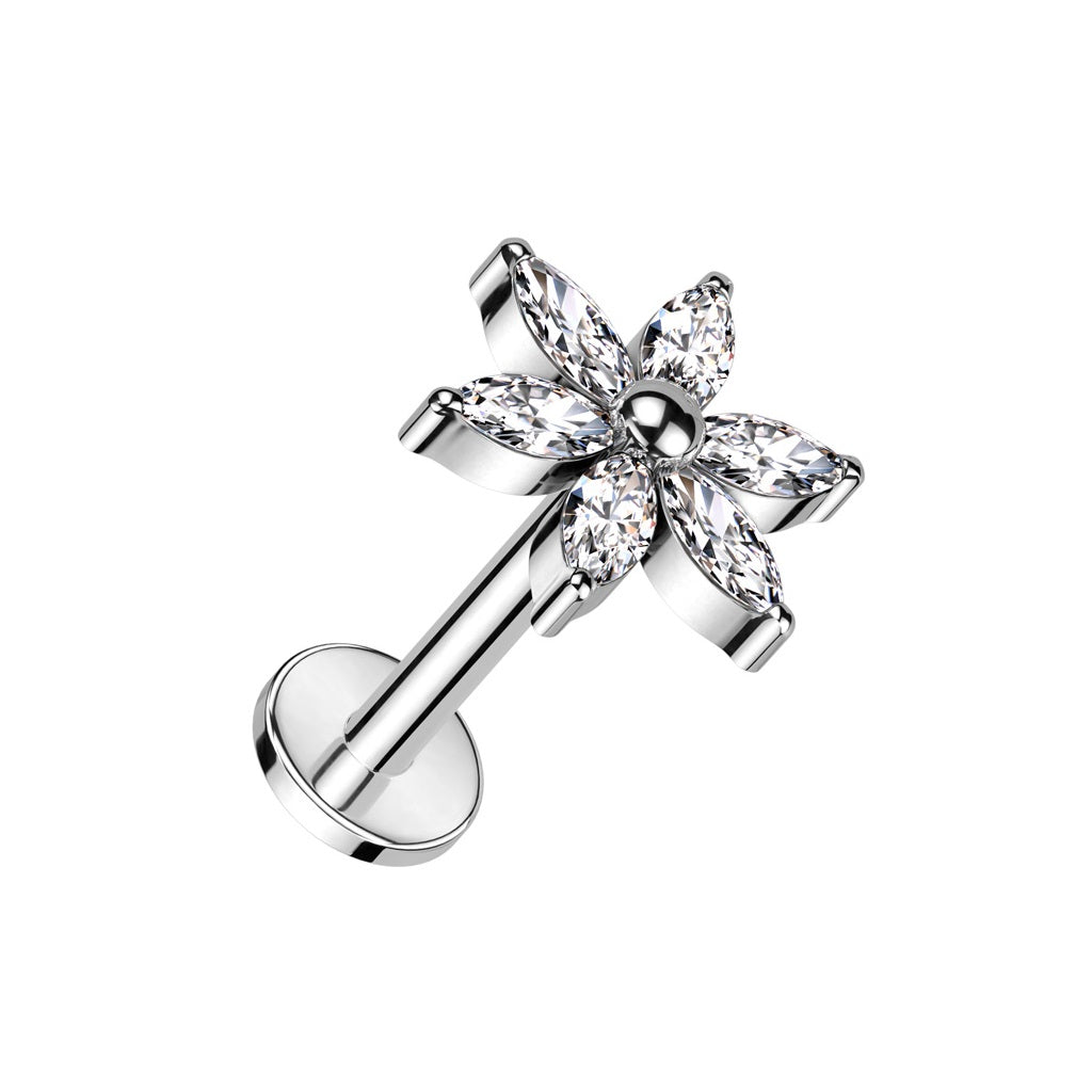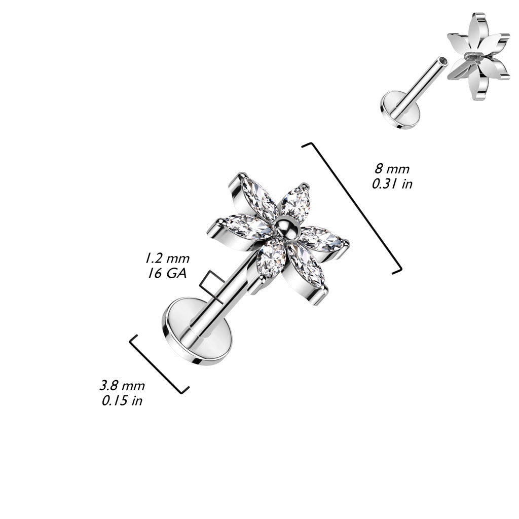 Internally Threaded CZ Crystal Multi Petal Flower Flat Back Stud - ASTM F-136 Implant Grade Titanium