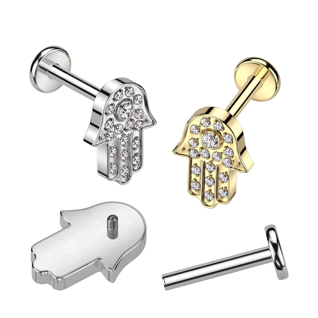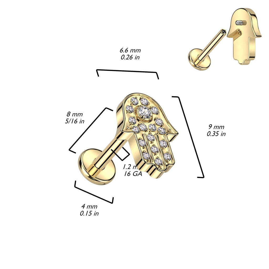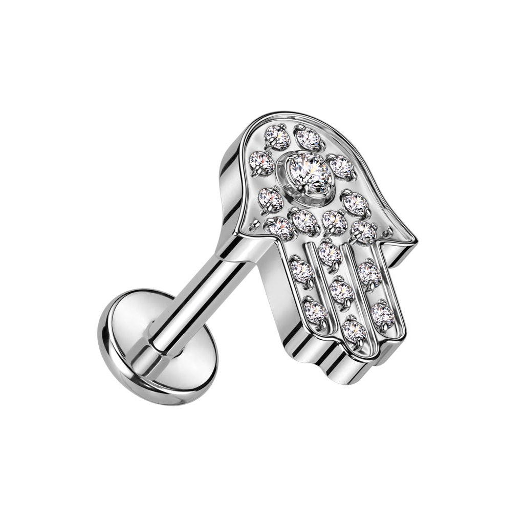 Internally Threaded CZ Crystal Paved Hamsa Top Flat Back Labret Stud - F136 Implant Grade Titanium