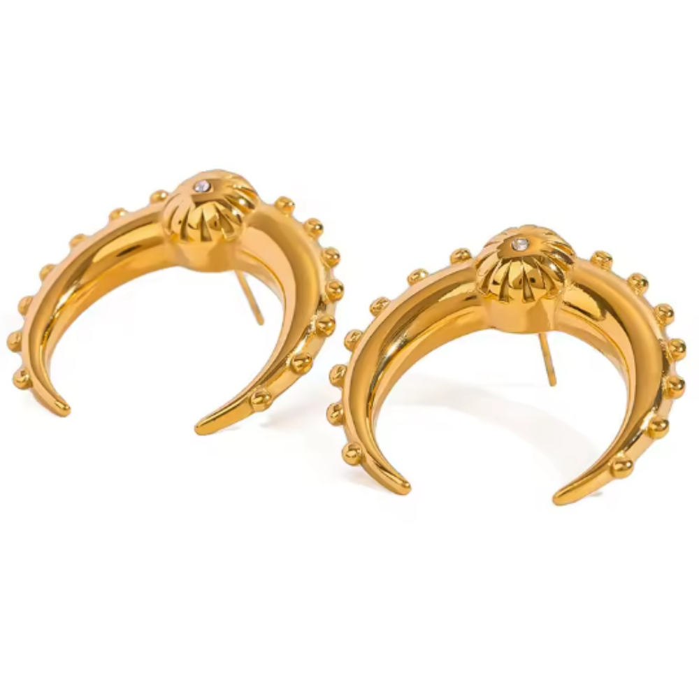 Ball Lined Crescent Moon Shaped Earrings - Pair - Gold Plated Stainless Steel