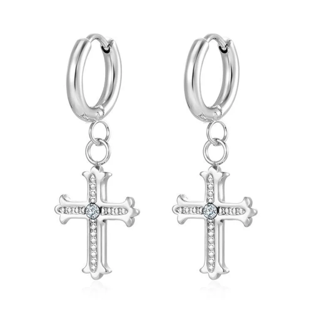CZ Crystal Cross Dangling Huggie Hoop Earrings - Pair - 304 Stainless Steel