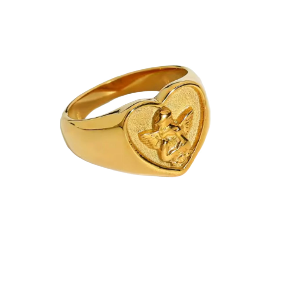 Heart Shaped Cherub Signet Ring - 18k Gold Plated 316L Stainless Steel